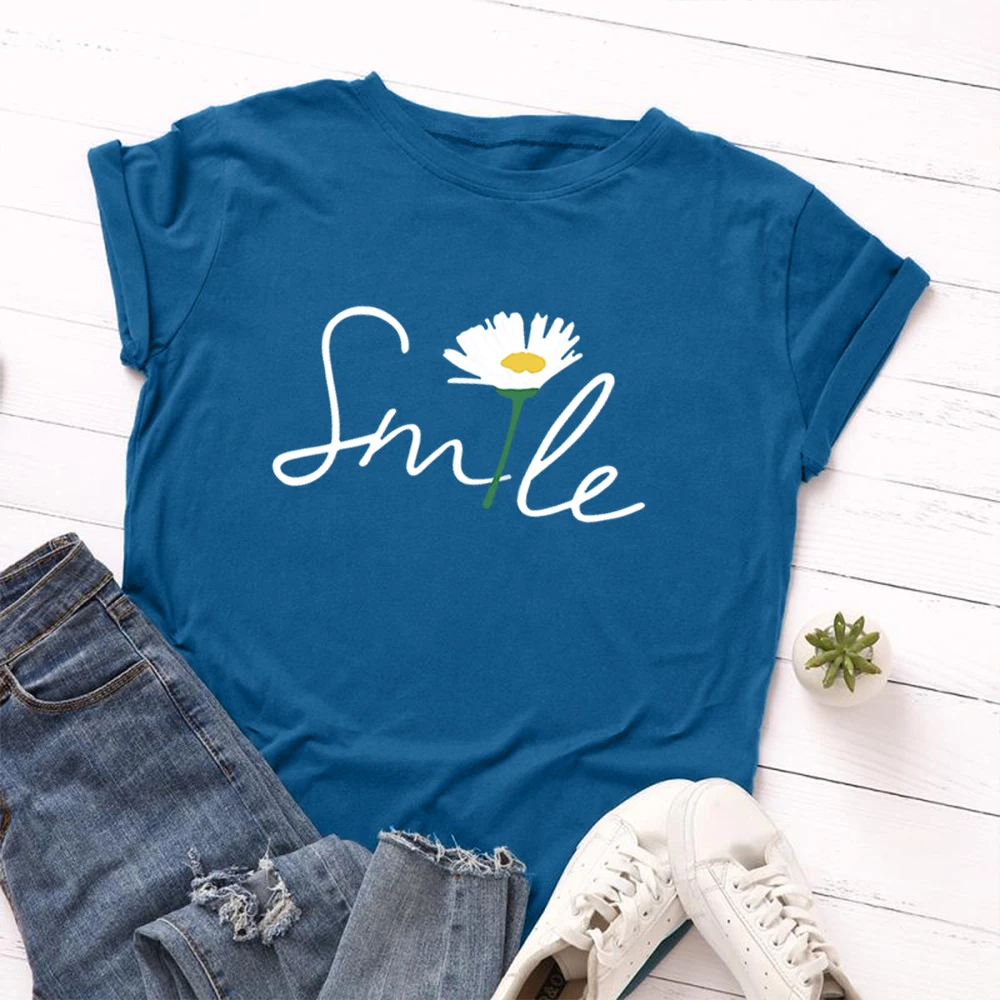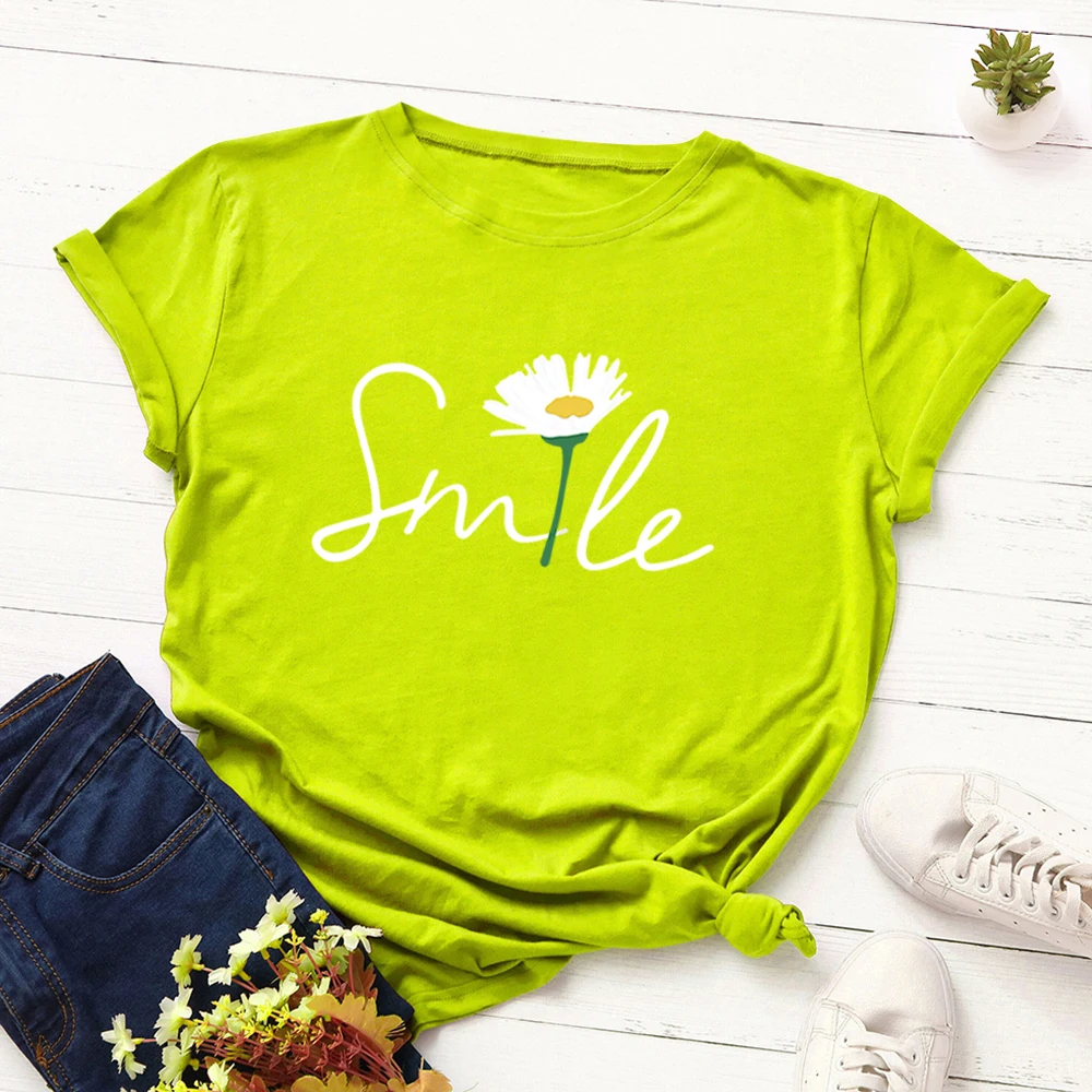 Женская футболка с цветочным принтом Daisy, летняя уличная футболка в стиле Харадзюку со смайликом и цветами, базовые футболки из 100% хлопка