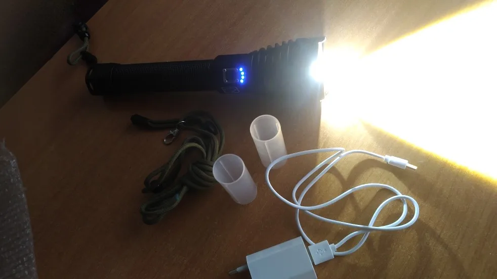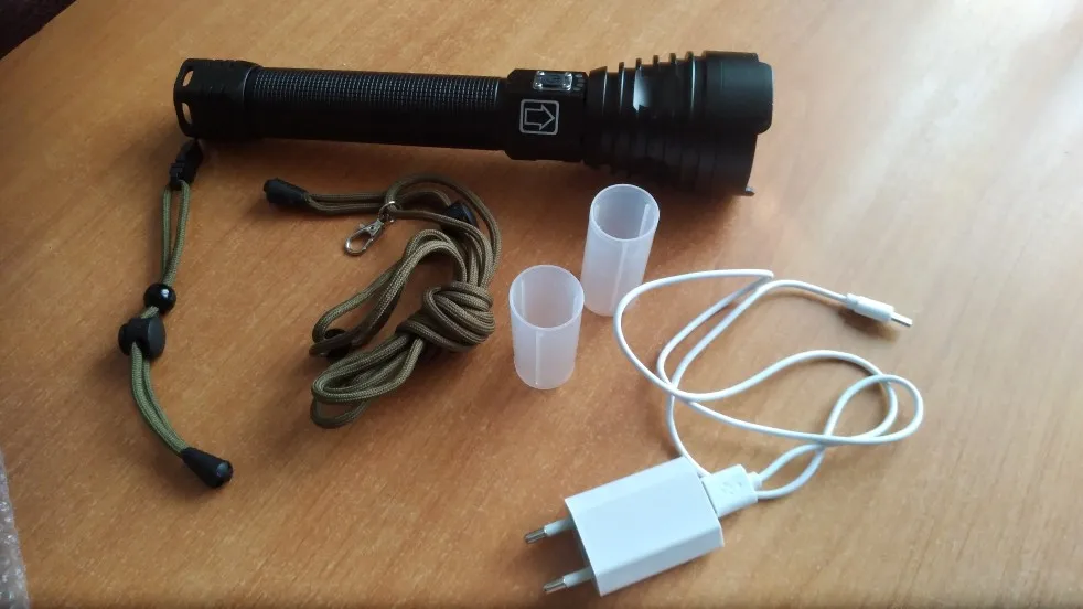 Вскрыл посылку, всё в норме,батареи были с изоляторами от включения.Заряжен на все .Светит отлично,проверял днём, расстояние не могу сказать-на сколько бьёт.Крмплектация совпадает,АБ.26650-2шт,зарядка со шнуром юсб,лямка для плечевого переноса-на первый взгляд фонарь очень качественный,при взятии в руку тяжёленький и по размеру внушающий.