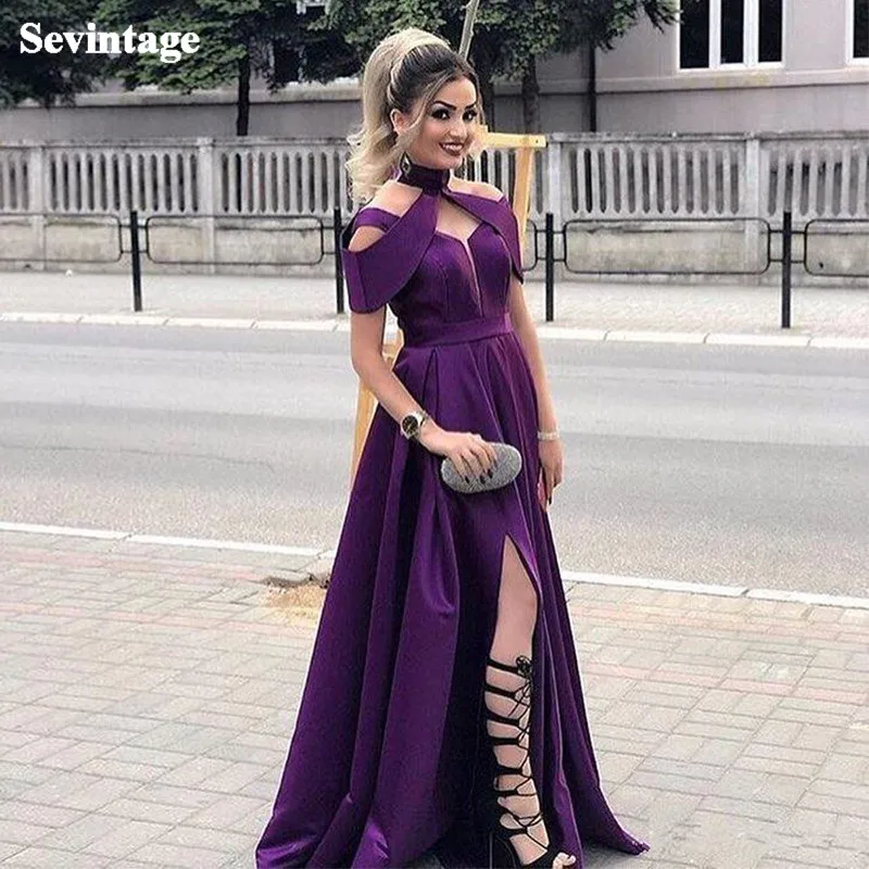 Sevintage Фиолетовое Атласное платье для выпускного вечера с лямкой на шее, длинное вечернее платье с разрезом, простые женские платья со складками для особых случаев, на заказ, 2020