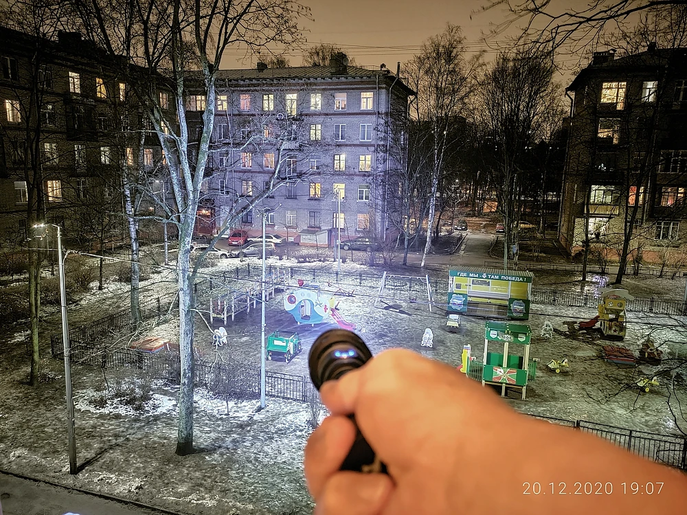 12 ноября - 20 декабря в Питер ... Принёс курьер на дом ... Свет, конечно, с синевой - на фотках аж ядовито-фиолетовый, светит сильно, но при таких размерах и весе мог бы светить ещё в 2 раза лучше, будь у него фирменный кристалл ... Аккумуляторы в старую LiitoKala Lii-500 засовываются только с криками, стонами и вазелином, и торцы постепенно продавливаются вовнутрь ... У родных аккумов плюсовой контакт торчит наружу с запасом ... Наболдажник фонаря немного побалтывается, дорожные знаки бликуют метров за 500