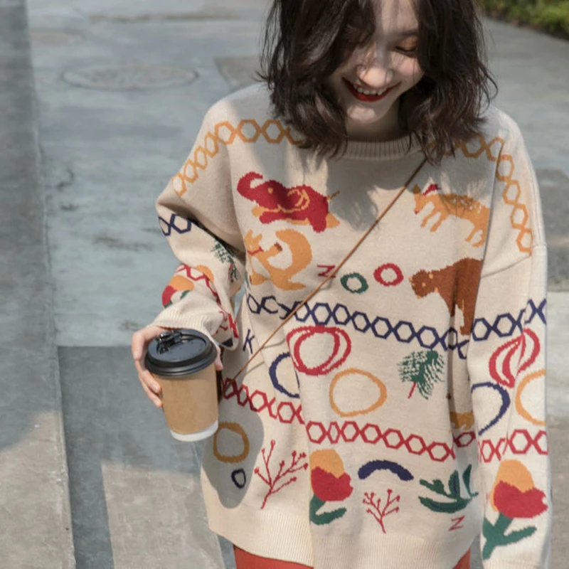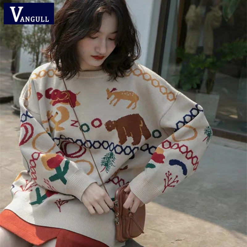 Женский вязаный свитер Vangull, с рисунком животных, с круглым вырезом, Свободный пуловер с длинными рукавами, зима 2020
