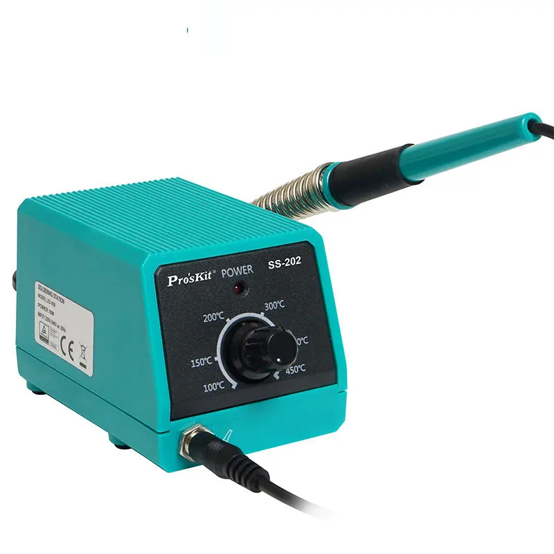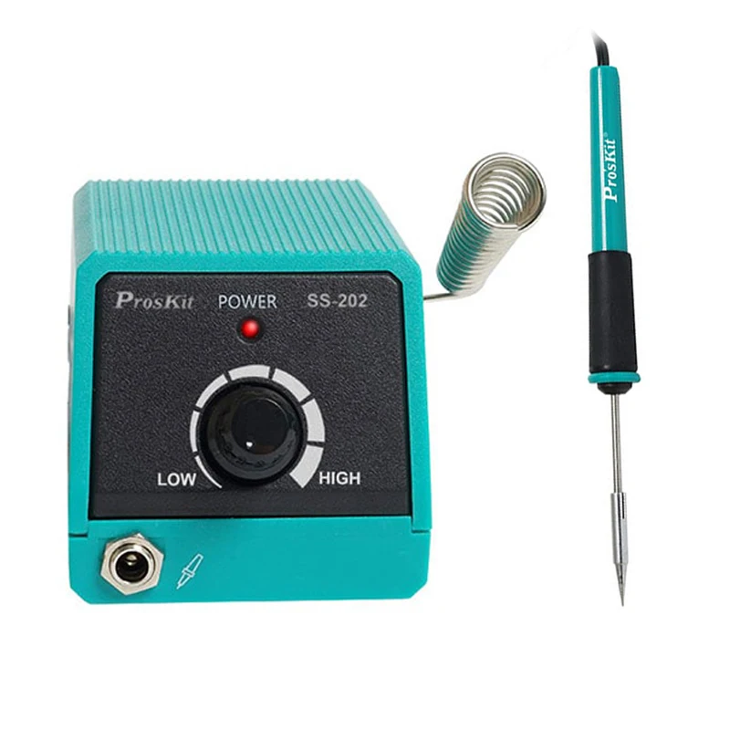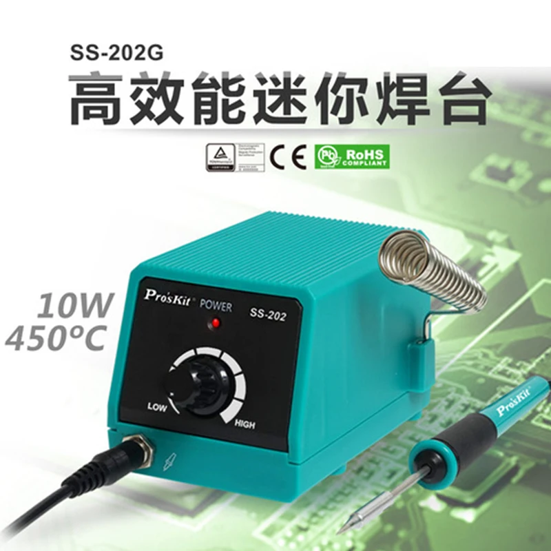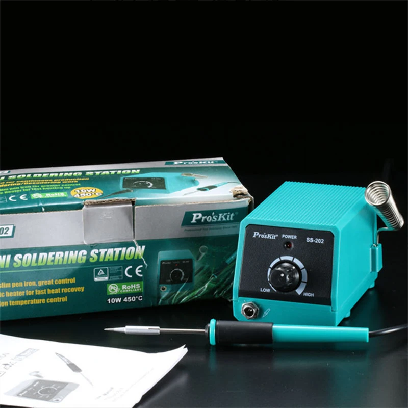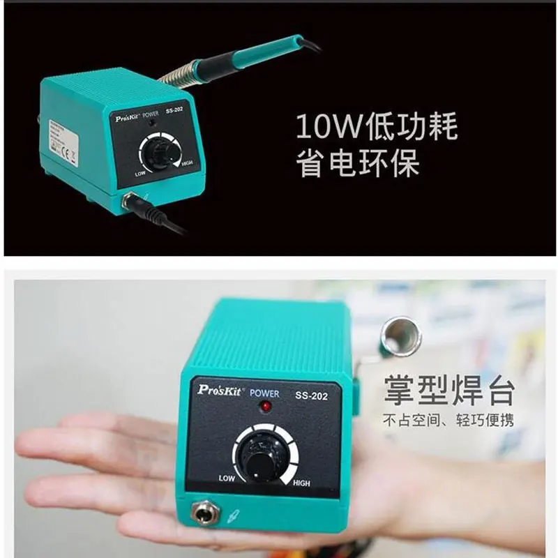 Pro'skit SS-202G professional Mini Soldering Station with slim soldering iron tips portable for soldering and desoldering Designed for continuous production SMD soldering/ desodering work Super slim pen-like style soldering iron for greater control and visibility Ceramic heating element for fast heating up Energy saving, Only 10W power consumption Stable Performance Temperature range: 100~450°C (212~842°F) Station includes power unit, soldering iron and stand