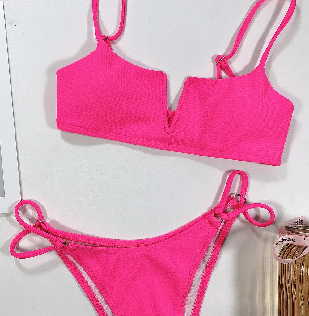 Купальный костюм из двух предметов, новинка, бандажная пляжная одежда с низкой талией, комплект бикини, флуоресцентный желтый купальник с V-образным вырезом, сексуальный женский купальник