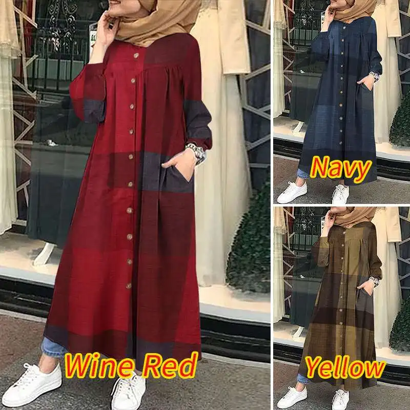 Посылка входит: 1 платьеМатериал: 65% хлопок + 35% вискозаЦвета: желтый, винный, темно-синийРазмер: S,M,L,XL,2XL,Длина рукава: полный рукавВырез: круглый вырезРисунок: сетчатый принтДлина: длина до середины икрыПряжка-цепочка: пуговица спередиТолщина: тонкаяУкрашение: боковые карманыСтиль: Досуг, ретро, Европа, мусульманское платье Абая кафтан, туника-кафтанСезон: весна, лето, осень, зимаПовод: семья вечерние, пляж, свадьба, праздник, работа