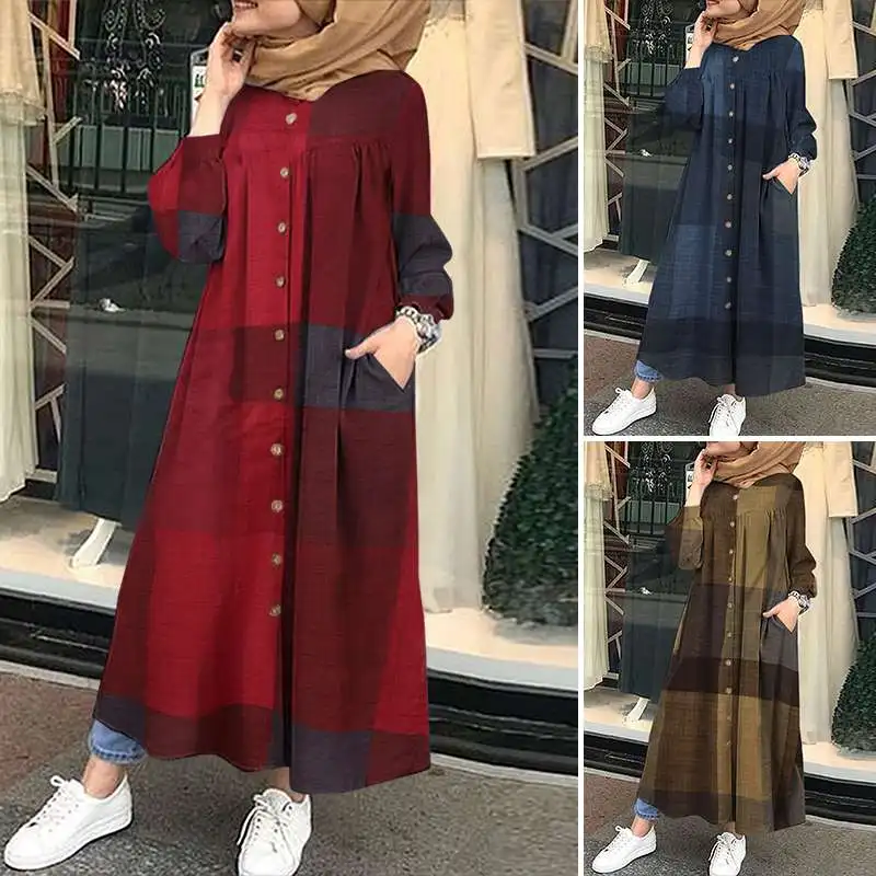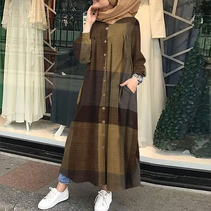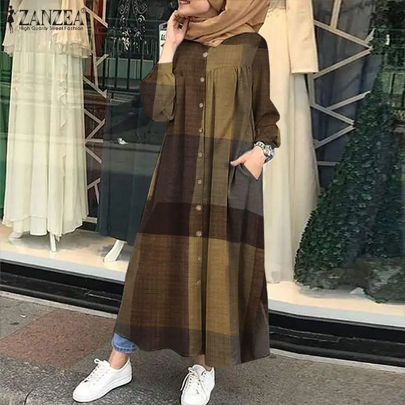 Женское мусульманское платье ZANZEA, Осенний винтажный сарафан в клетку с длинным рукавом, свободный длинный женский халат, мешковатые платья