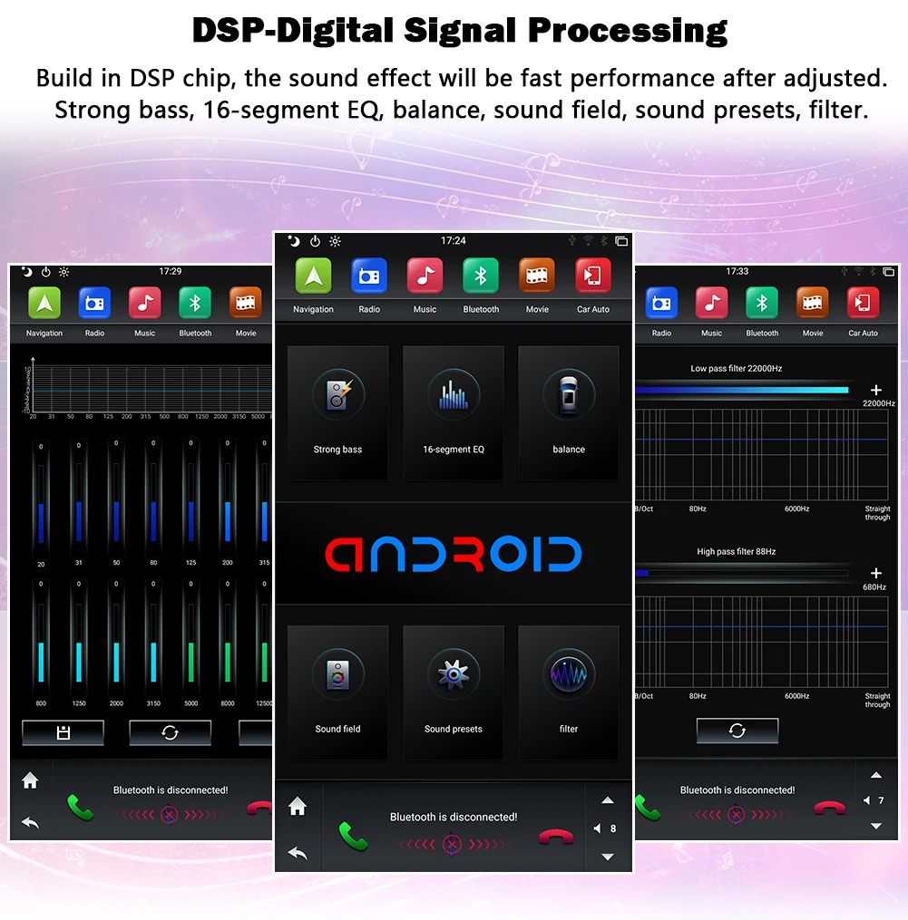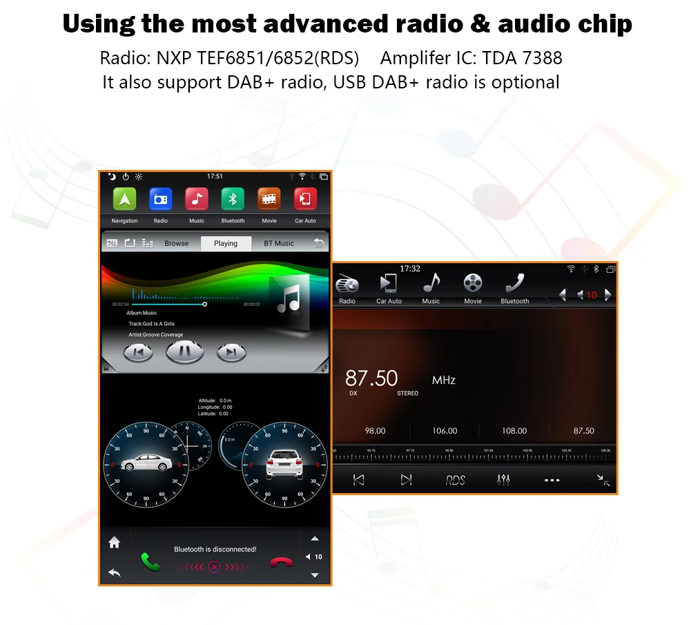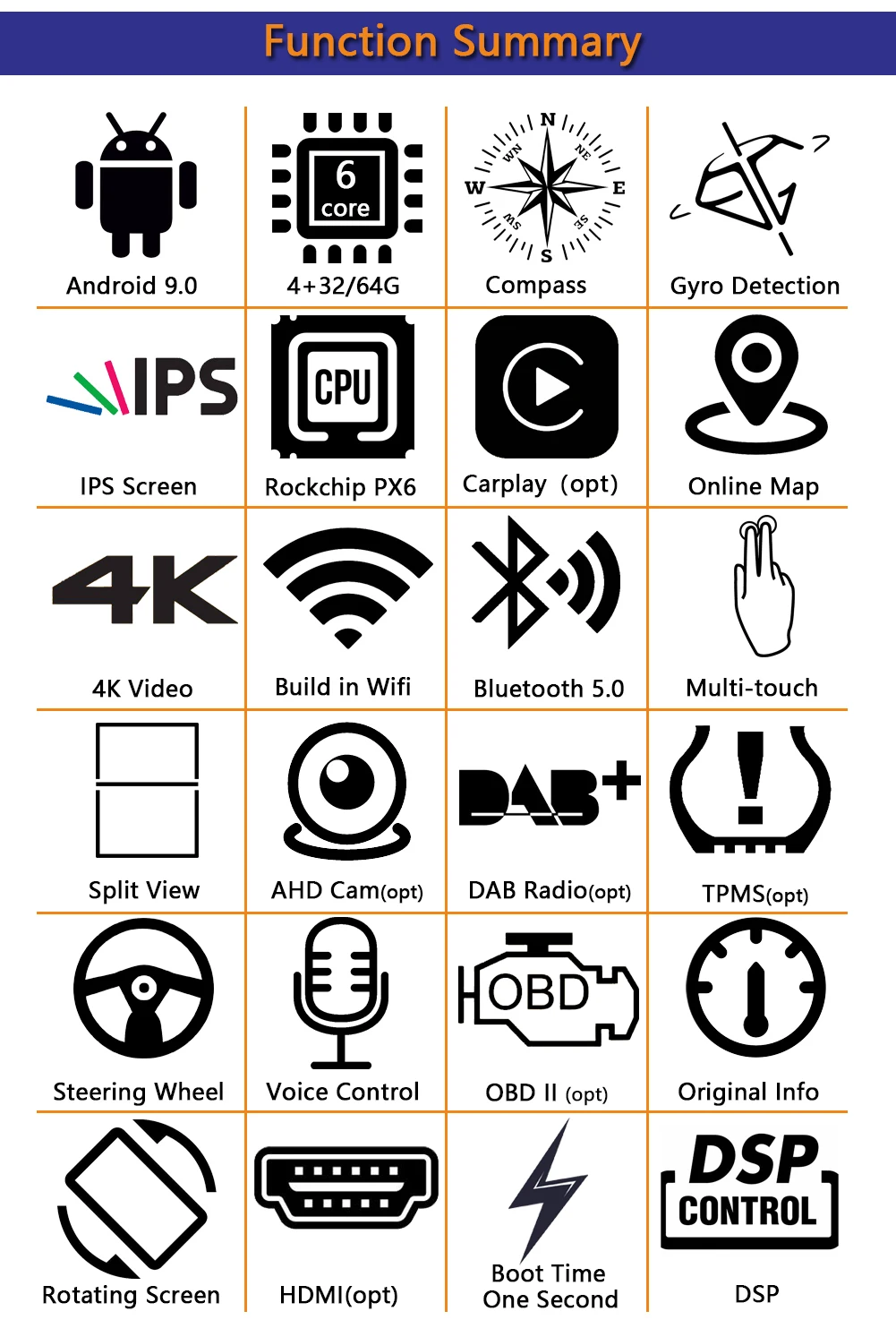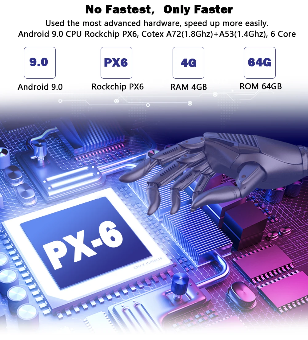 ОС: Android 9,0Процессор: с двумя камерами, процессор Rockchip PX6, Cortex-A72 6 ядер, частота 1,8 ГГцОперативная память: SAMSUNG 4 ГБ DDR3Nand Flash : 64 ГБУсилитель IC: TDA7850Радио: NXP6686(RDS)Bluetooth: Qualcomm BT5.0ЖК-экран: TFT монитор IPS экранСенсорный экран: емкостный и сенсорный экран
