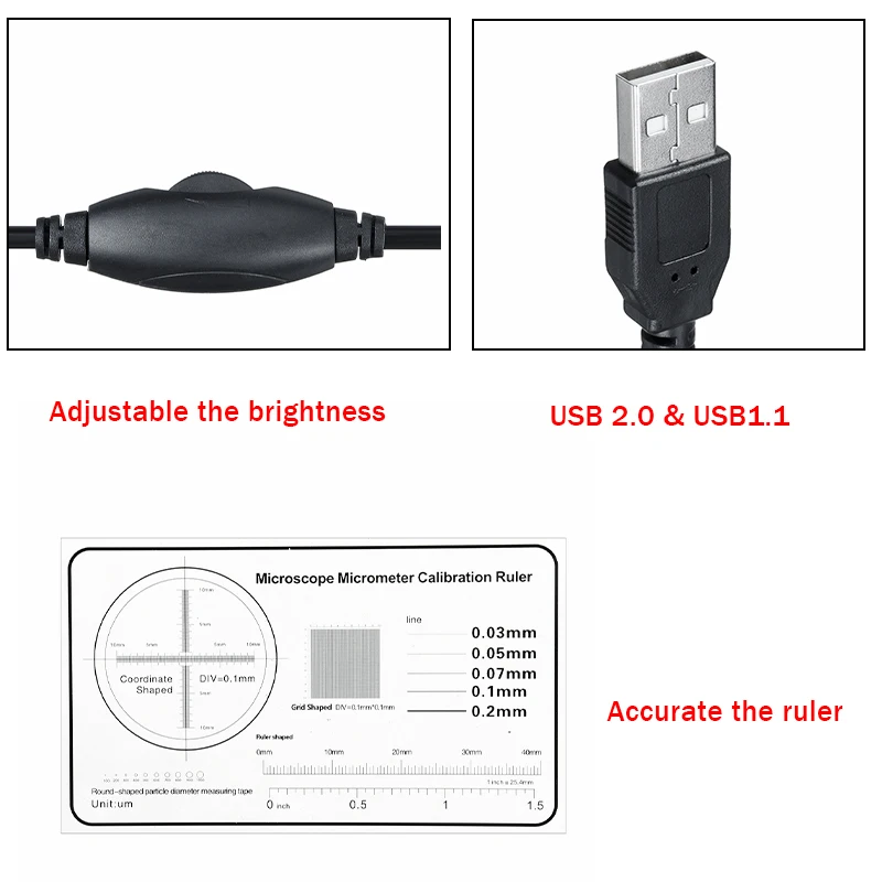 Посылка включает в себя:1 x цифровой микроскоп1 x подставка1 x USB линия1 x специальный микрометр коррекции линейки для микроскопа1 ИнструкцияПримечание:1. Замеры сделаны вручную, поэтому возможны отклонения на 0,5-1 дюйм. (1 дюйм = 2,54 см)2. Цвет фактического товара может немного отличаться от изображения из-за различий в экране компьютера, спасибо за понимание.