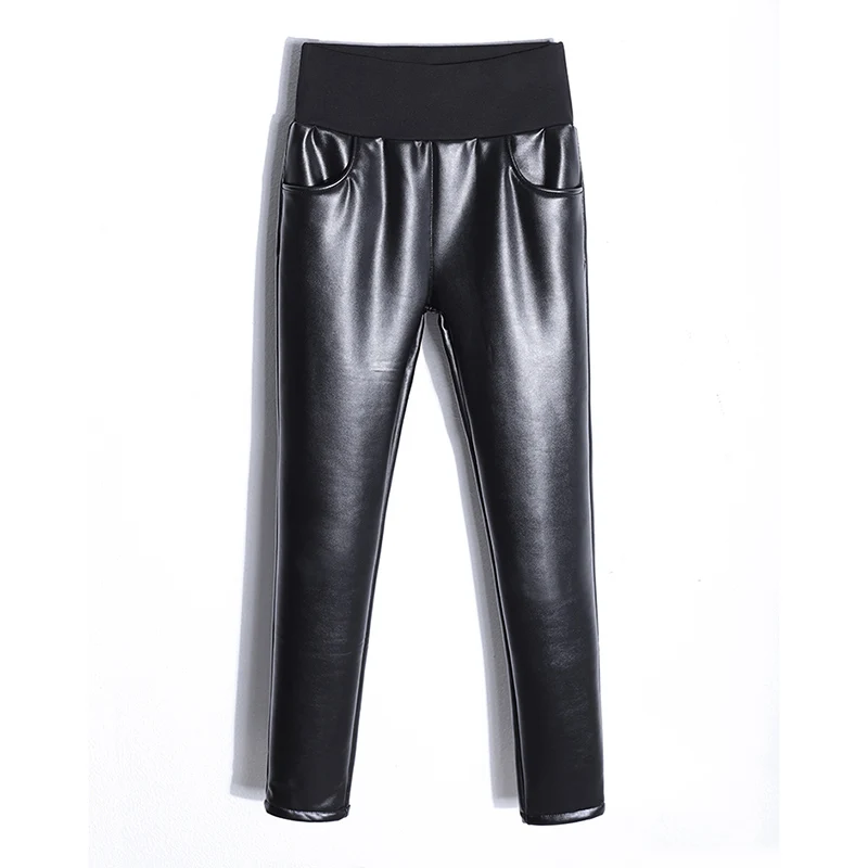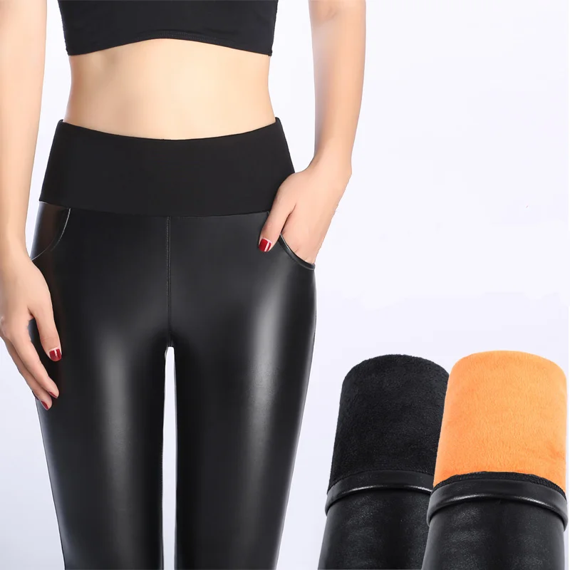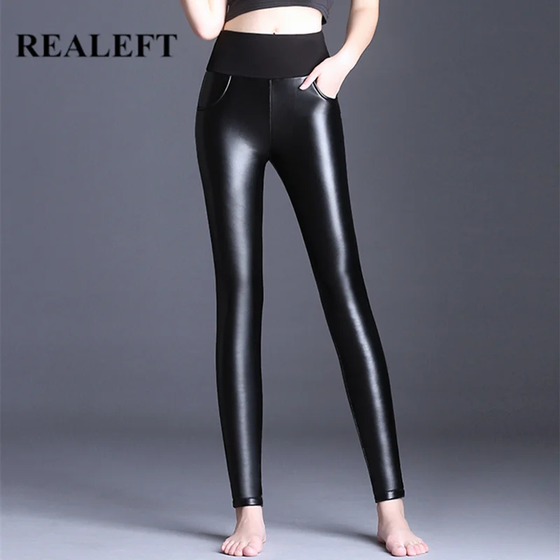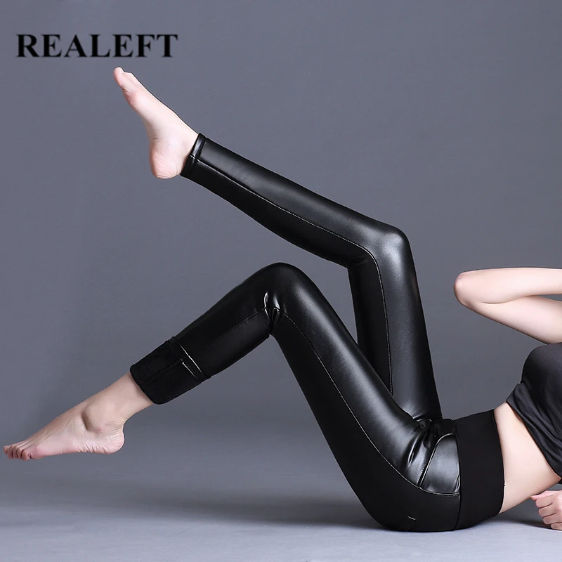 Новинка 2021, осенне-зимние черные женские брюки REALEFT из искусственной кожи, бархатные теплые брюки, эластичные облегающие брюки, кожаные леггинсы-карандаш