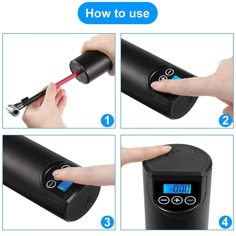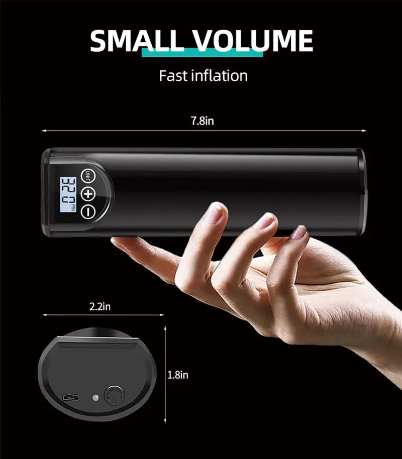 Характеристика:● Беспроводной и портативный: беспроводной дизайн и компактный мини-размер делают воздушный компрессор портативным и простым в эксплуатации одной рукой.● Быстро надувать и автоматически: электрический воздушный насос с 4 переключаемыми блоками давления (PSI, BAR, KPA, KG/cm2), так что вы можете установить давление в шинах по желанию. Компрессор автоматически отключается при достижении установленного давления в шинах. Максимальное давление составляет около 150 фунтов на квадратный дюйм● Аккумулятор большой емкости: с 2000 мАч сертифицированным литий-ионным аккумулятором, этот портативный компрессор готов надуть велосипед, мяч и т. Д.● Применение в ночное время: 2 встроенный светодиодный свет, который может автоматически включаться и вид сзади делают мини-компрессор простых в использовании Применение даже в ночное время.● Многофункциональный: этот воздушный компрессор поставляется с 3 адаптерами сопла. Можно надуть рядом с шинами, а также шариками, воздушными матрасами, игрушками.Параметры-Емкость аккумулятора: 2000 мАч-Эффективность надувания: 15 л/мин-Давление надувания: 150 фунтов на квадратный дюйм (макс.)-Единицы измерения давления: PSI, BAR, KPA, KG/CM2Наружный шланг для подачи воздуха длина: 13 см ± 0,5 см (5,1 ± 0,2 дюйма)-Рабочая температура: 0 °C ~ 60 °C-Размеры: 5,5*4,5*19,8 см (2,2*1,8*7,8 дюймов)-Вес: 360 г/0.8lb-Максимальное непрерывное время работы: 8 мин Многократное использование предназначено для вашей жизни-Для автомобилей/SUV/RV шин-Для велосипедных/мотоциклетных шин-Для спортивного оборудования-Для надувных игрушекПримечание: Не для фургонов, автобусов, домов, грузовиков.