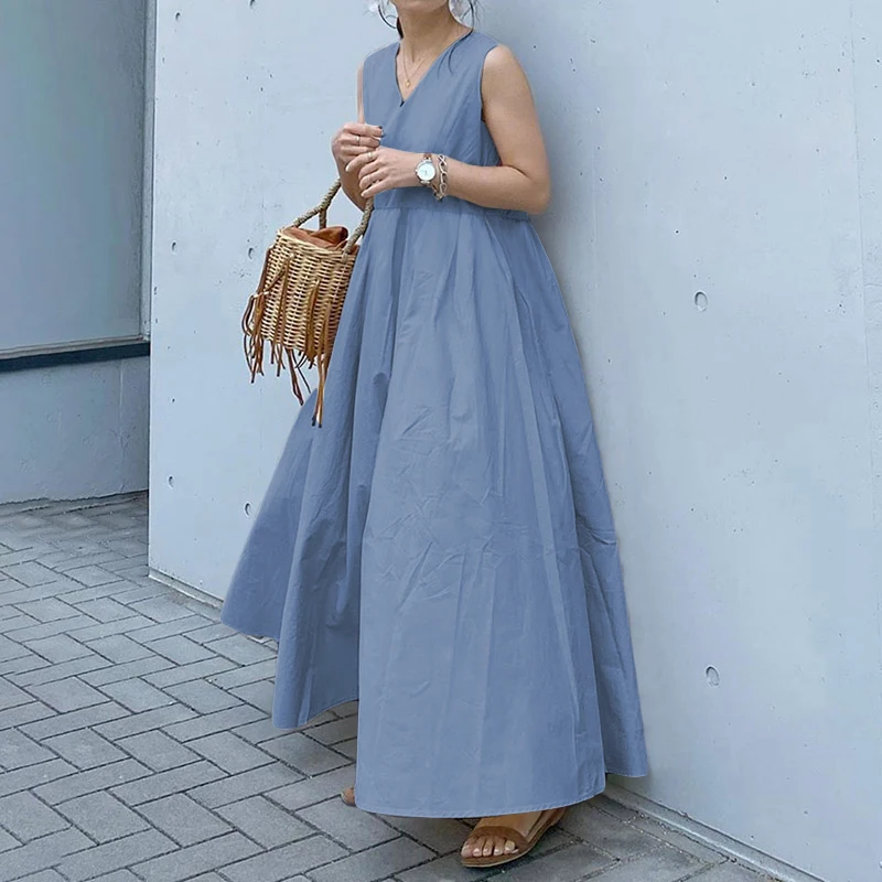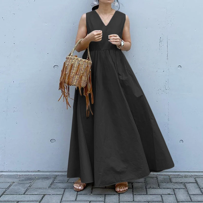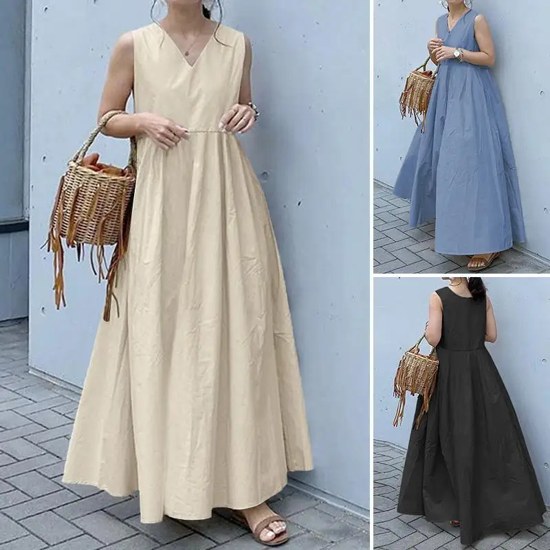 Посылка входит: 1 платьеМатериал: 80% полиэстер + 20% хлопокЦвета: черный, светло-синий, бежевыйРазмер: S,M,L,XL,2XL ,,,Длина рукава: без рукавовВырез горловины: v-образный вырезРисунок: однотонныйДлина: до щиколоткиТолщина: тонкаяСтиль: Отдых, ретро, ЕвропаСезон: летоПовод: семья вечерние, пляж, свадьба, праздник, работа