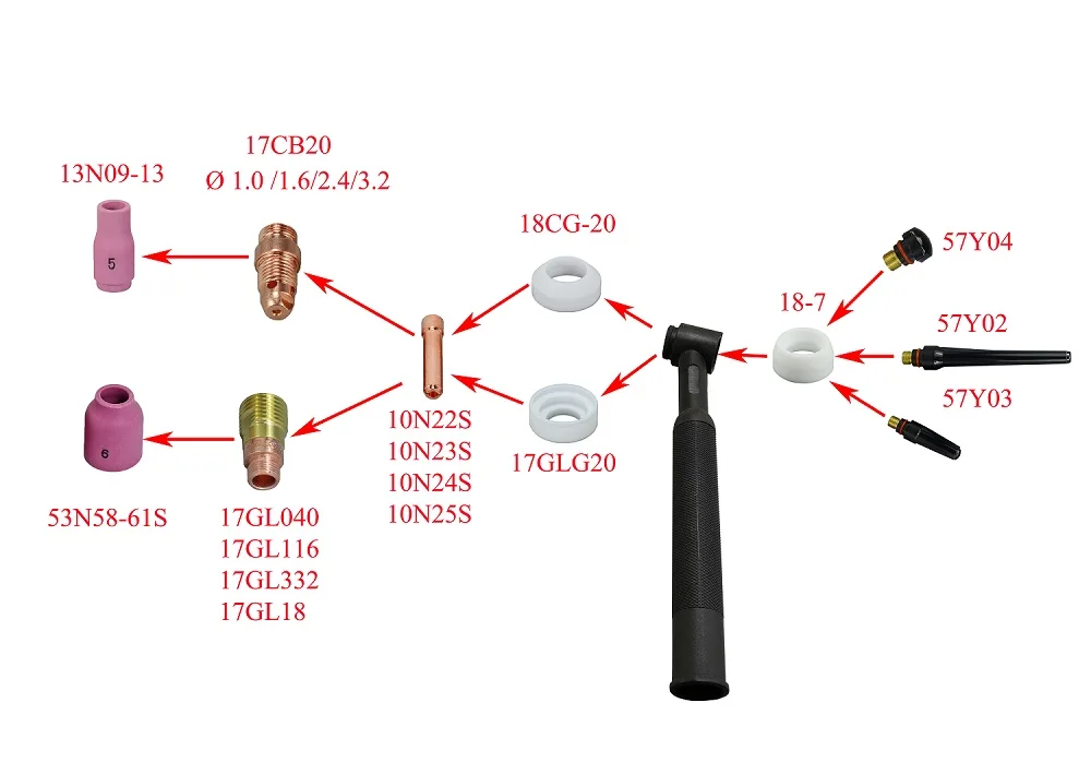 Этот комплект подходит для всех факелов с воздушным охлаждением серии 17 и 26 и факелов с водяным охлаждением серии 18,Включая PTA-17, PTA-18 и PTA-26 факелами, DB18 и DB 26 факелами, Miller Diamondback DB17, вместе с Weldcraft WP-17, WP-18 и WP-26 факелами.