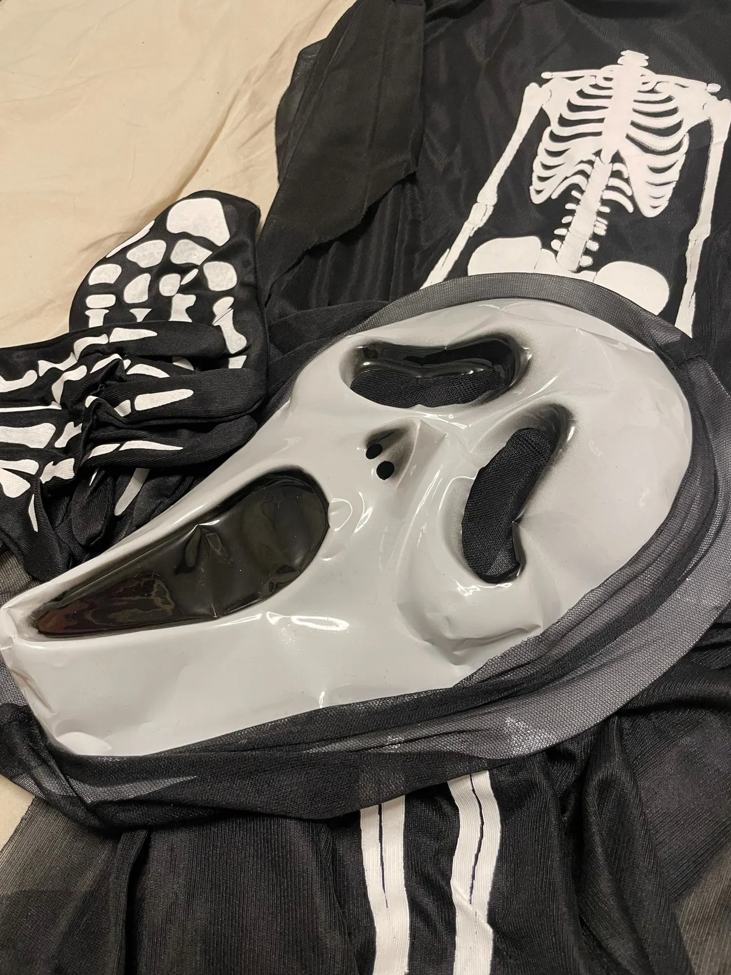 Костюм на один раз, лёгкая полупрозрачная ткань как из тюли. Маска из тонкого пластика как у нас бутылки с минералкой делают, вот такой тонкий… 1 пальцем замять можно, впрочем и того не потребовалось, т.к. кто-то замял ее до нас (при доставке). Брала костюм на ребёнка и все как бы ок, но перчатки положили на взрослого. Впрочем, возможно за 500 руб. много хочу. Доставили быстро, от того необходимости общения с продавцом не возникало.