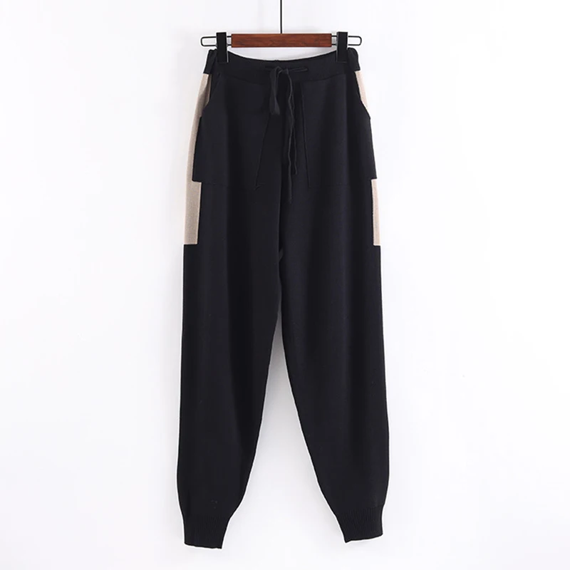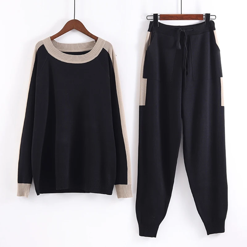 Женский модный Свободный вязаный костюм большого размера, новинка 2021, осенне-зимний топ с круглым вырезом и длинными рукавами + брюки на шнуровке, Женский комплект из двух предметов