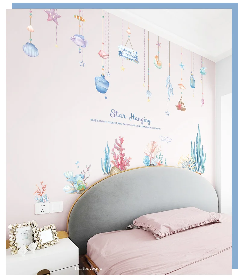 Супер классные виниловые наклейки! Абсолютно не портят обои! Комната сразу быстро и легко преобразилась! Доставка быстрая! Клеила одна, без помощи. Так что справитесь легко. Сын в восторге. Он вообще очень любит морскую тематику, а тут прям все: кит, водоросли, ракушки, звёздочки, декор различной этиологии...