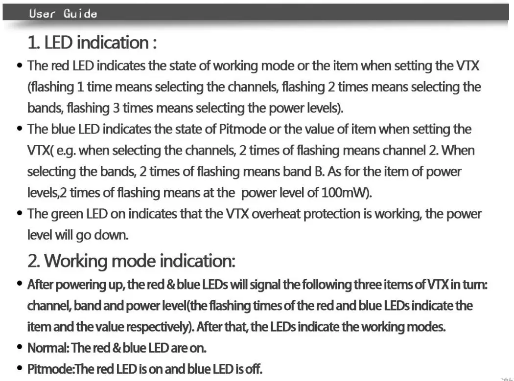 -50 мВт/100 мВт/питmode-SBUS Настройка мощности, диапазонов, каналов и Pit Mod-Камера 800VTL, 170 поле обзора-Изображение: 4:3-Поддерживает включение/выключение питема-3 светодиодный лампы, 1 кнопка-3,7 V источника питания: 400MA/100 мВт.Размер: 15*15*16 ммВес: 4,2 гМощность питания AC/DC 2,8-5,5 V• Сила тока: 330mA(50 мВт)/400mA(100 мВт) 3,7 VМощность: 50 мВт/100 мВт/питmode