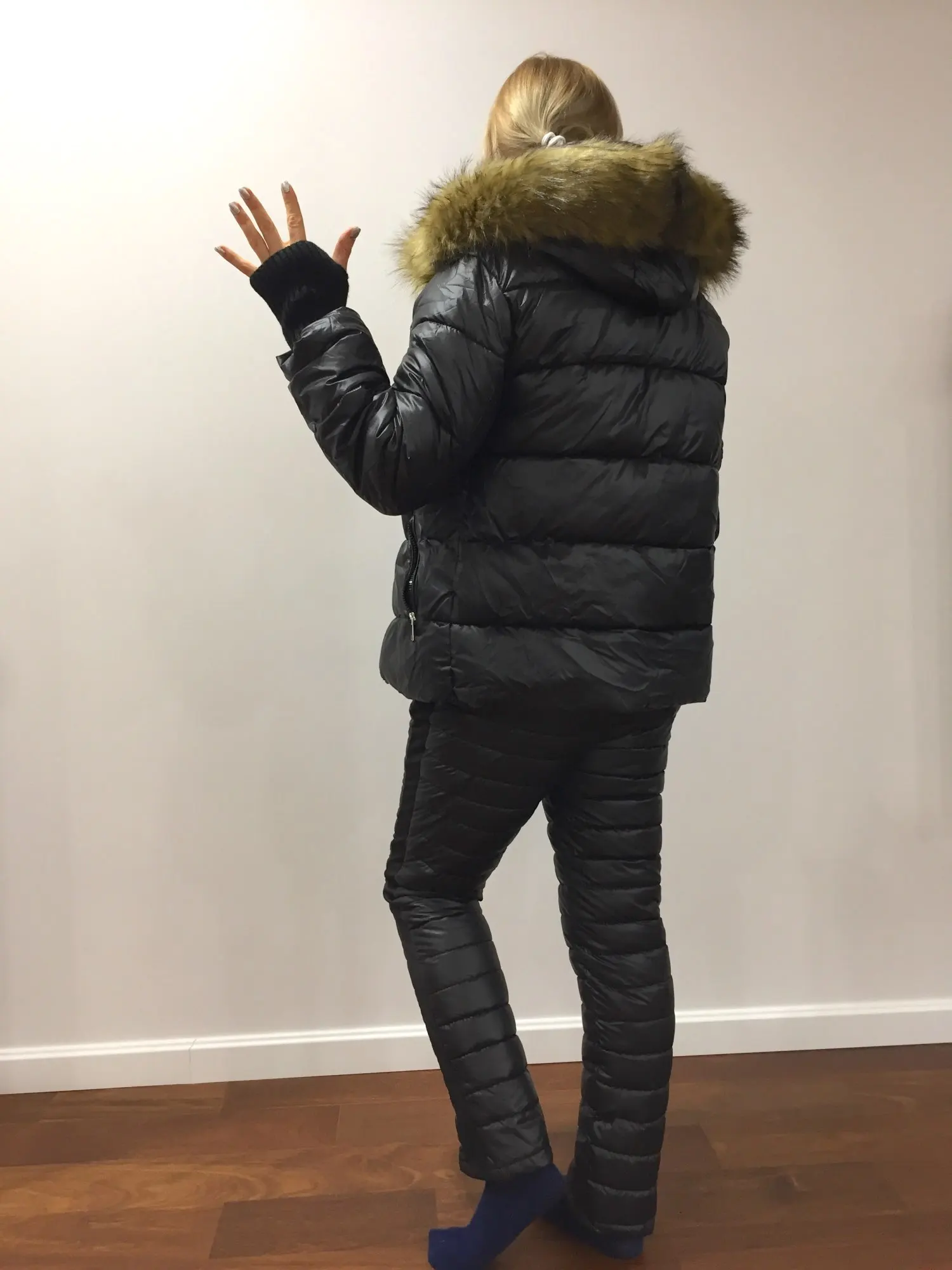 Все пришло быстро, упаковка была немного повреждена, но костюм цел. Швы ровные, цвет хороший, запах небольшой есть, надеюсь пройдёт. Размер xl брала на мой 44, Куртка отлично, штаны сидят плотно на коленях. По бокам на штанах просто ткань тянучая, надеюсь не будет холодно. Мех Хороший. Спасибо.