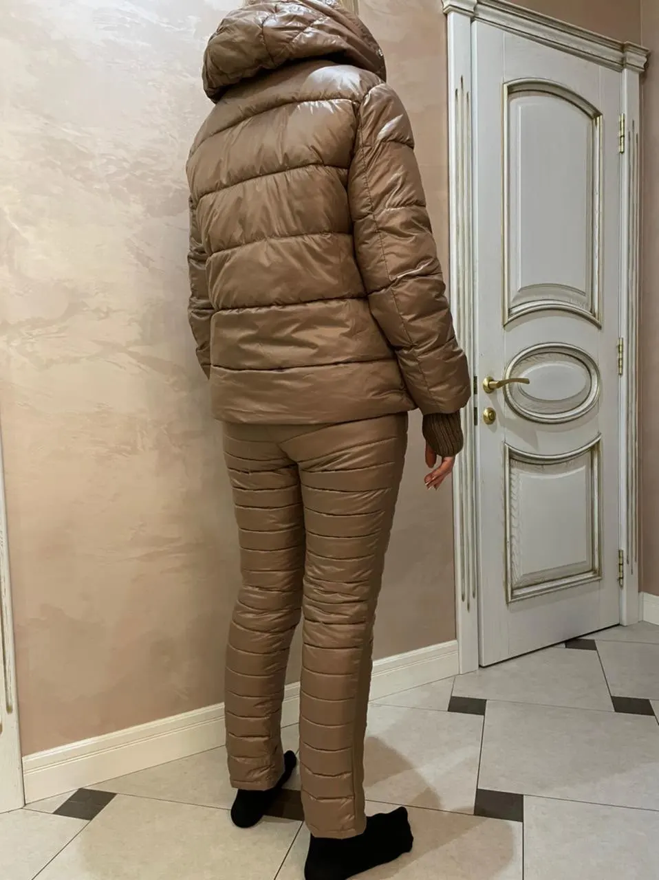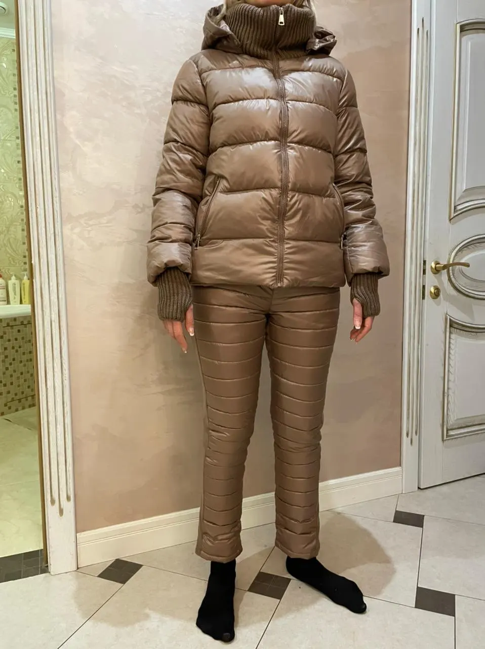 очень тёплый, лёгкий, удобный, красивый костюм. пришёл во время, качество хорошее, размер в размер по таблице продавца хорошо подошёл.