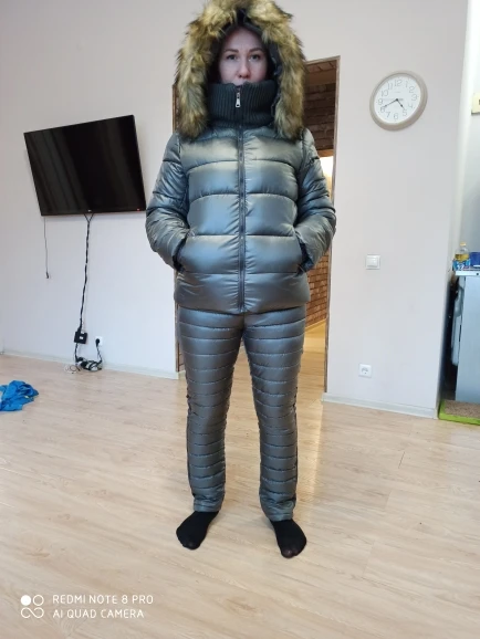 На мой размер 42-44 заказала L по отзывам. Куртка подошла хорошо, не тесно и не большая, а вот штаны мне оказались большими, так как ноги у меня худые) Пришлось покупать другие. И мех на куртке искусственный я убрала и пришила натуральный) А так костюм очень тёплый! В - 20 одевала одну водолазку под куртку и даже вспотела) Штаны кстати на рост 170 чуть коротковаты.
