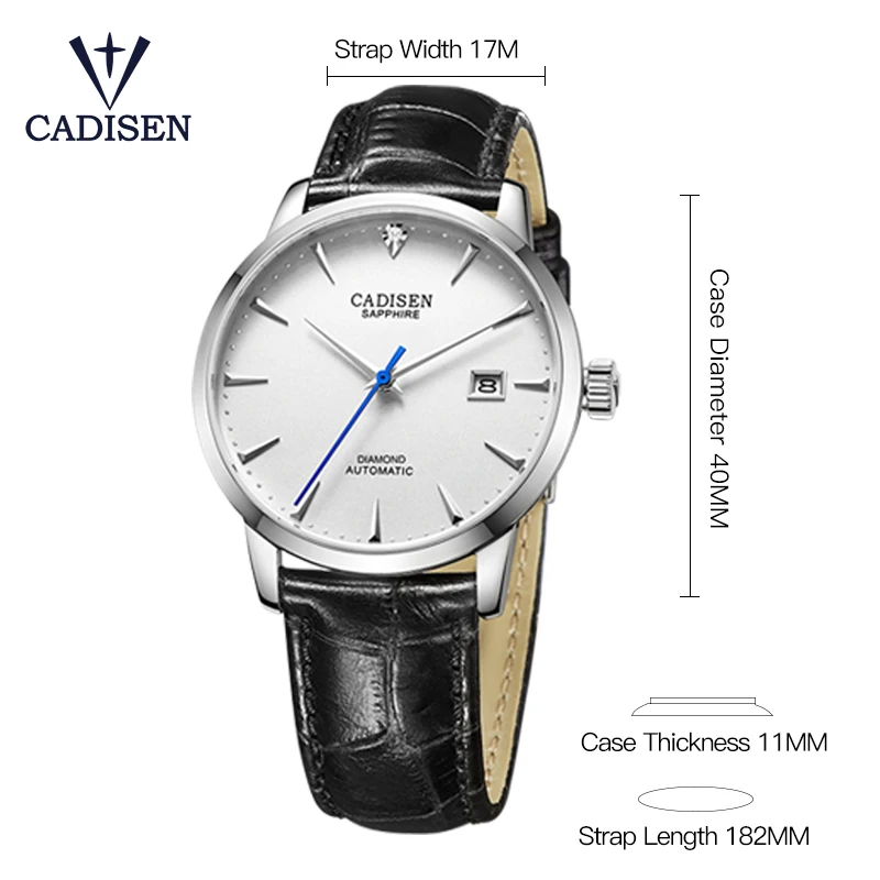 Описание продукта: -Южная Африка настоящий Алмаз инкрустация на часах. -CITIZEN MIYOTA 9015 автоматическое механическое движение. -Корпус из нержавеющей стали 316L -Высококачественный ремешок для часов из натуральной кожи. -Водонепроницаемость на глубине до 50 м. -Гарантия 12 месяцев Характеристики (прибл.): -Диаметр корпуса часов: около 4,0 см -Толщина корпуса часов: около 1,1 см -Длина ремешка (включая чехол): около 22,0 см -Ширина ремешка: Около 2,0 см Посылка включает в себя: -Новые часы CADSIEN -Одна коробка. -Руководство по эксплуатации, гарантийный талон. -Одна ткань для чистки часов