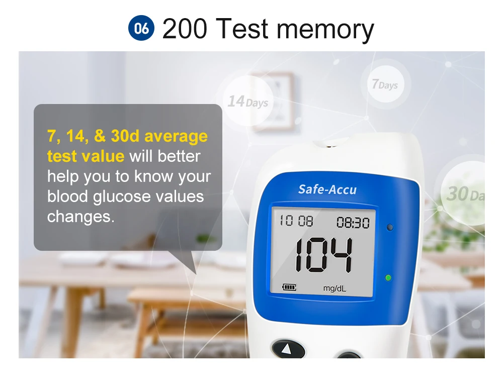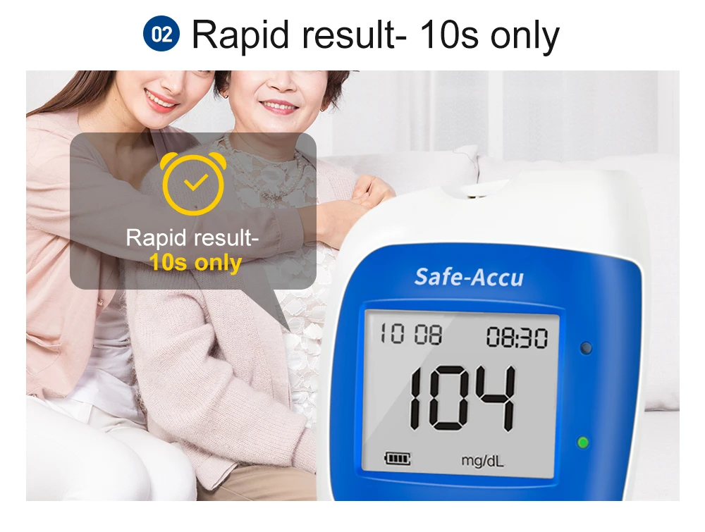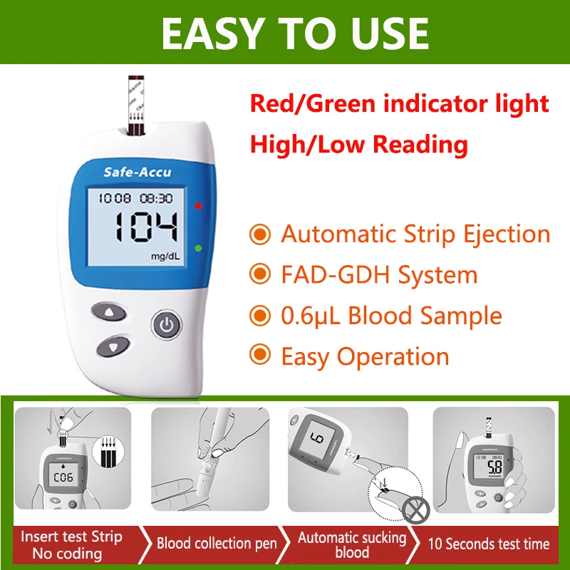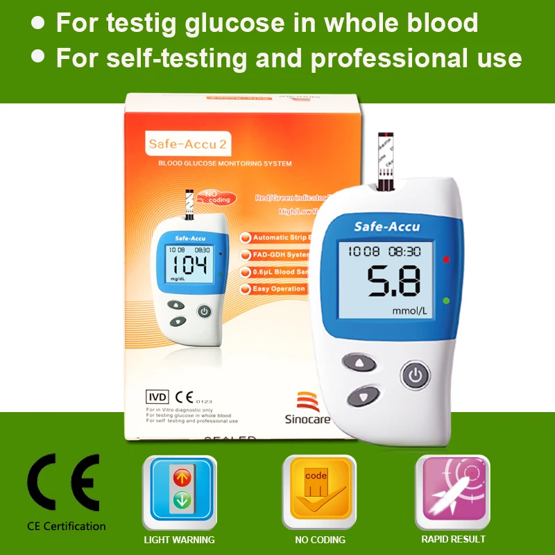 Часто задаваемые вопросы: 1. Лучшее время для измерения: (1) натощаяся глюкоза в плазме (не менее 8-10 часов без пищи, кроме воды). (2)2 часа после еды (время начинается с первого укуса) 2. Нормальный диапазон: (1) пост глюкоза в крови (FBG): 3,9-6,1 М моль/л (70-110 мг/дл).(2) постпрандиальное сахар в крови (2 часа после приема пищи): 3,9-7,8 М моль/л (70-140 мг/дл). * Формула преобразования единиц: Концентрацию глюкозы в крови обычно используют два метода: один-ммоль/л, другой-мг/дл. Две единицы концентрации глюкозы могут быть преобразованы друг в друга, коэффициент конверсии составляет 18. Преобразованный из ммоль/л в мг/дл-это первый (ммоль/л) умножьте 18; И, напротив, на мг/дл-ммоль/л-бывший (мг/дл), деленный на 18. 3. Образец теста: (1) следует дожидаться, пока спирт улетучится, так как остаточный спирт влияет на измеренные значения. (2) Первая собранная вами кровь не может быть использована в качестве образца, что может быть смешано с тканевой жидкостью. 4. Использование: Кровь должна быть закрыта на край тест-полосок, что позволяет крови эффективно впитываться тестовой бумагой. И он должен поставить кровь на другую сторону бумаги, которая близко к маленькому порту в верхней левой части. И затем поверните машину на 45 градусов, чтобы она подошла к этому всасывающему порту. 5. Ошибки: Отклонение от 15% до 20%. Отклонение в результате тестирования может быть вызвано неправильной операцией, диетой или изменением эмоций. И ошибка в измерении уровня глюкозы в крови была менее 20%, что не повлияло на лечение пациентов.
