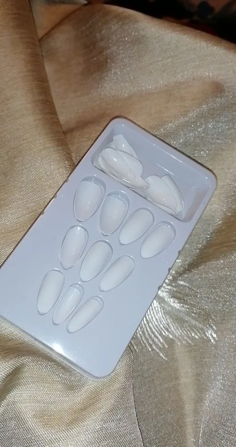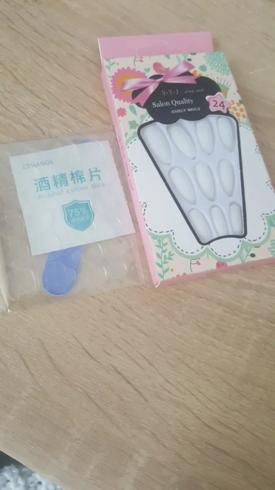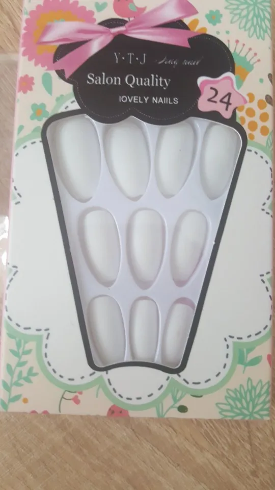 Качество ногтей хорошее, материал плотный. Форма не понравилась, подпилила. Доставка курьером. Посылка где-то за неделю пришла. Довольна покупкой. Выглядит натурально, если смотреть на ногти строго сверху-вниз. При всяких боковых поворотах руки уже видно, что что-то не так. В комплекте были наклейки для ногтей. Надела их в воскресенье вечером. Первый ноготь отвалился в понедельник утром. Наклейка просто растворилась, возможно не перенесла контакта с моим уходом для тела. Второй снялся, когда с усилием пыталась запихнуть туфли в сумку. Наверное, надавила как-то не так, отлетел. Остальные прочно держались до конца недели, потом сама отклеила.