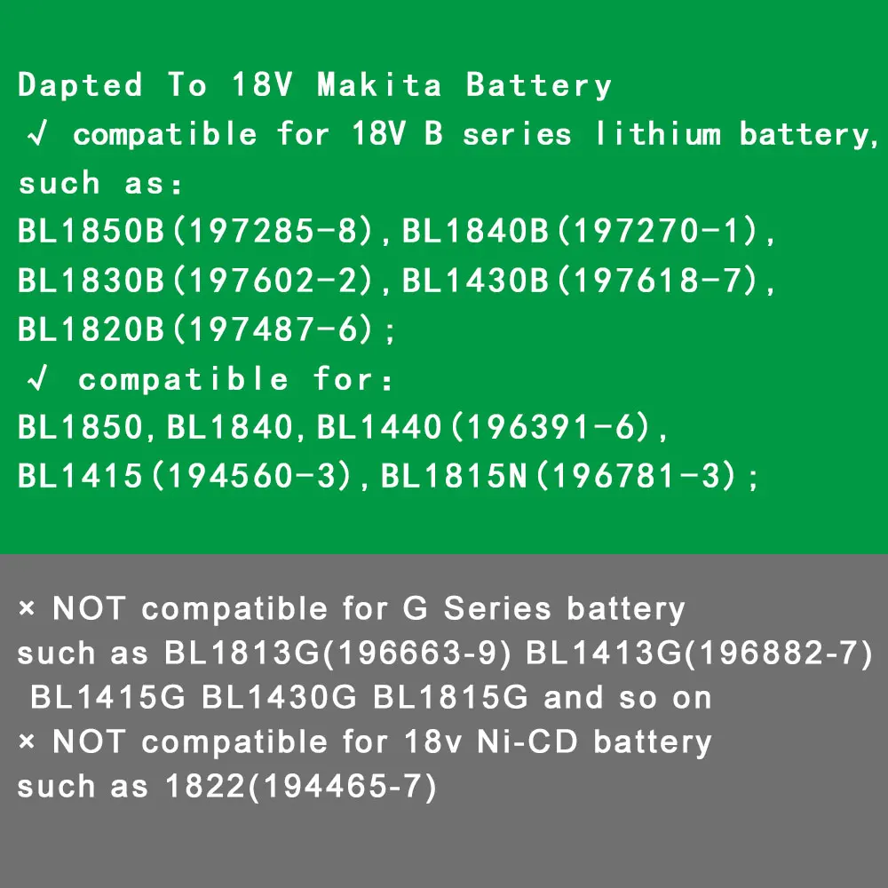 √ Совместимость с литиевыми аккумуляторами серии B 18 в, такими как BL1850B(197285-8),BL1840B(197270-1),BL1830B(197602-2),BL1430B(197618-7),BL1820B(197487-6);√ Совместим с BL1850,BL1840,BL1440(196391-6),BL1415(194560-3),BL1815N(196781-3);× Не совместим с аккумуляторами серии G, такими как BL1813G(196663-9) BL1413G(196882-7) BL1415G BL1430G BL1815G и т. д.× Не совместим с никель-кадмиевыми аккумуляторами 18 в, такими как 1822(194465-7)