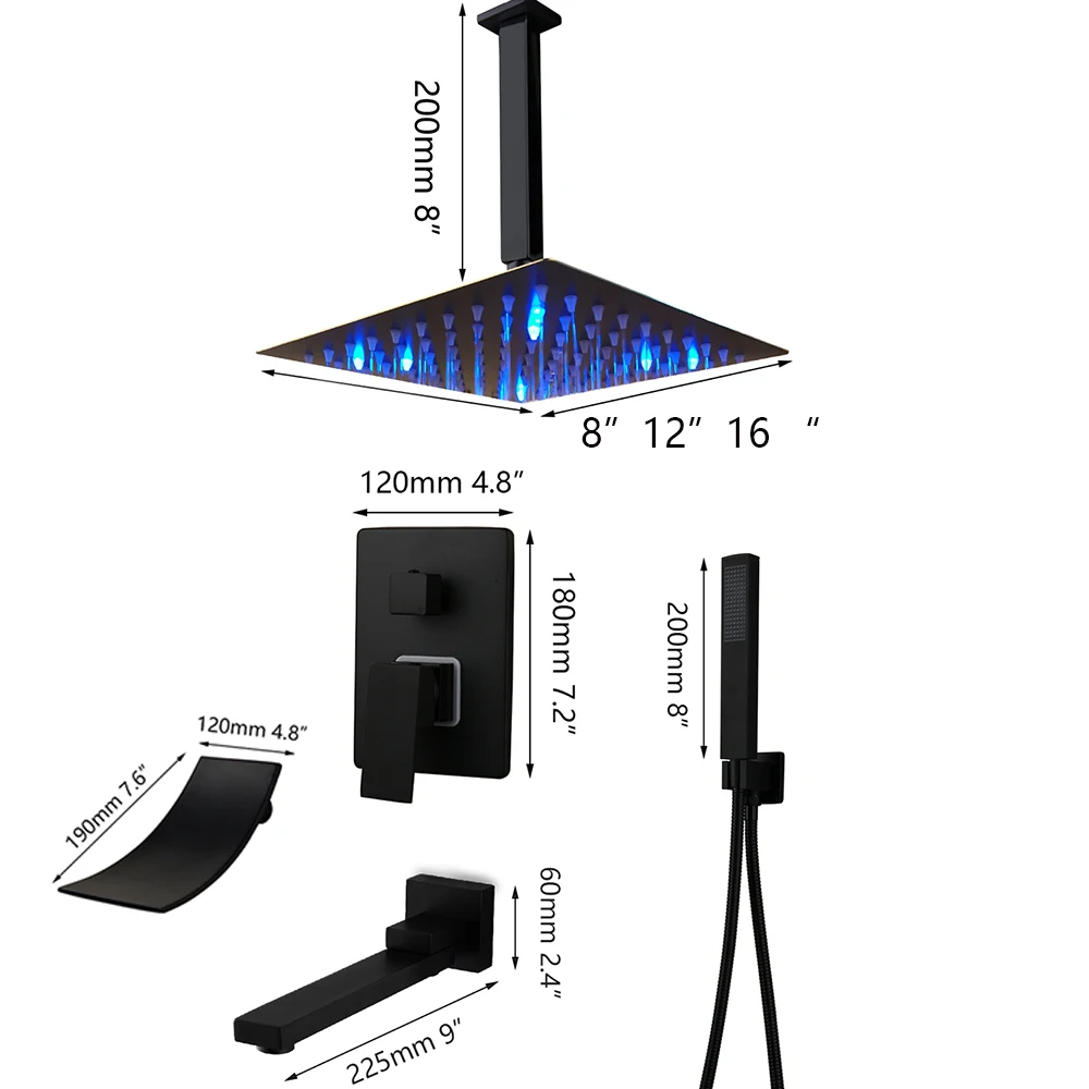 Матовый черный смеситель для душа Monite 8, 12, 16 дюймов, светодио...