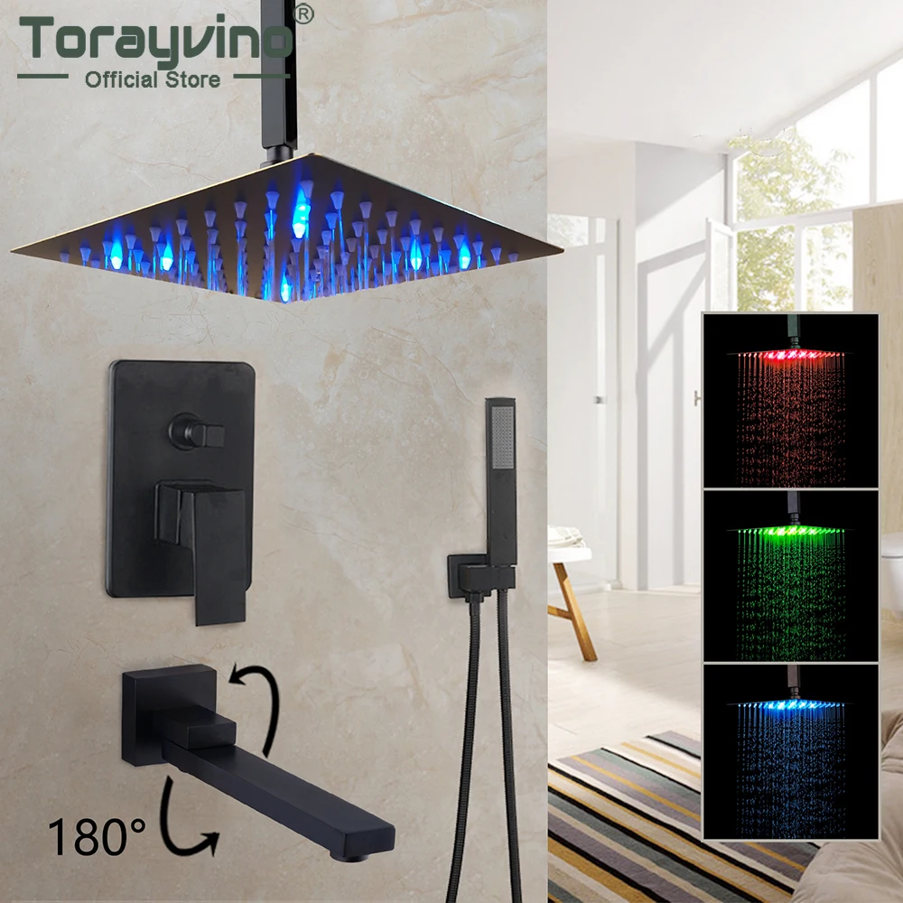 Torayvino LED ванная комната смеситель для душа набор матовый черный дождь водопад потолок и настенный скрытый душ система смеситель кран