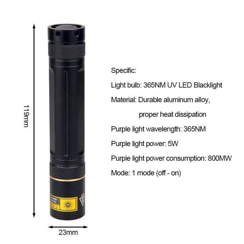 Спецификация:Лампа-светильник: 365нм Светодиодный УФ-черный светильникМатериал: прочный алюминиевый сплав, правильное отведение теплаФиолетовый светильник Длина волны: 36 нмФиолетовый светильник Мощность: 5 ВтФиолетовый светильник Потребляемая мощность: 800 МВтРежим: 1 режим (вкл.)Батарея: 1 шт. 18650 перезаряжаемая литиевая батареяРазмеры: 119 мм (длина) x 23 (головка) x 23 мм (диаметр)Вес: 54 г.Посылка 1 список:1 x 365нм УФ-фонарик1 х Ручная ВеревкаПосылка 2 списка:1 x 365нм УФ-фонарик1 х Ручная Веревка1x1865 0 батарея1xUSB зарядное устройство