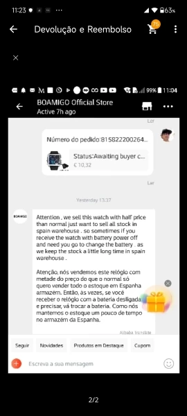 Я хочу отправить вам больше доказательств, чем Часы, которые я купил у вас, вы отправили их мне, и они не работают, и вы не позволяете мне закончить процесс спора, и вы не хотите ничего знать, я надеюсь, что это будет служить моим делом, чтобы сомневаться в этом магазине, Я чувствую себя обманутым.