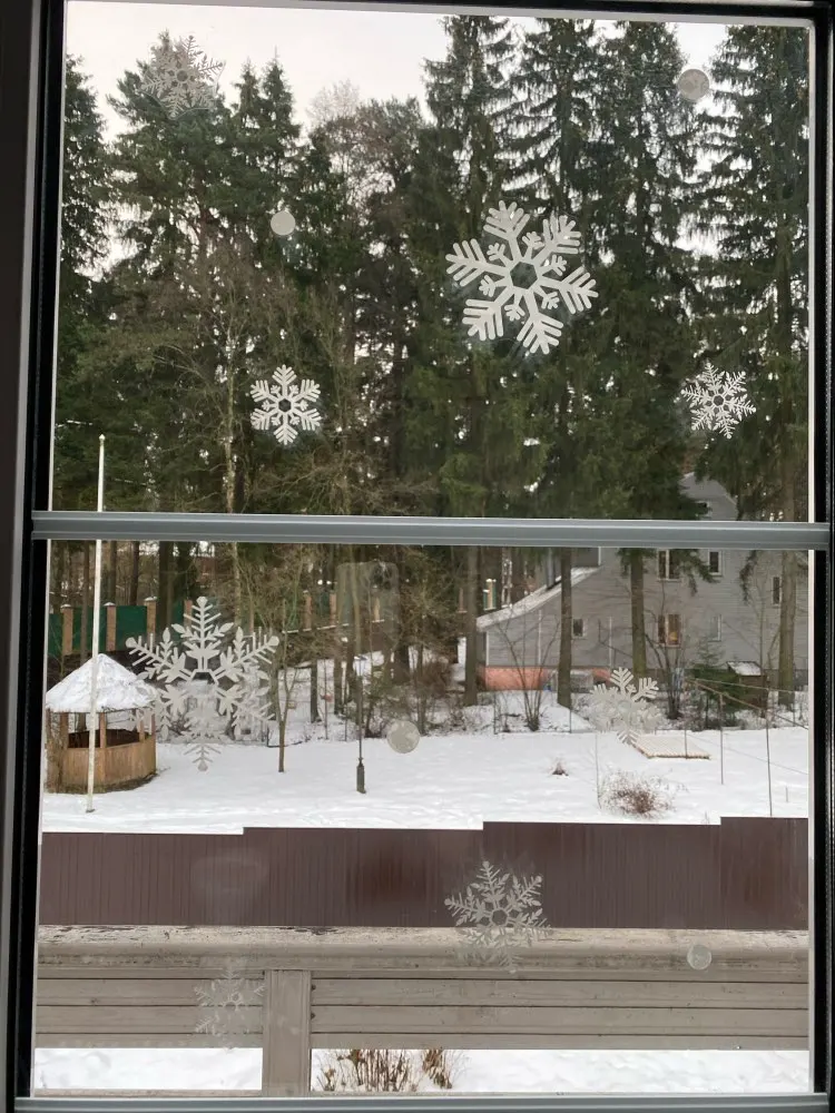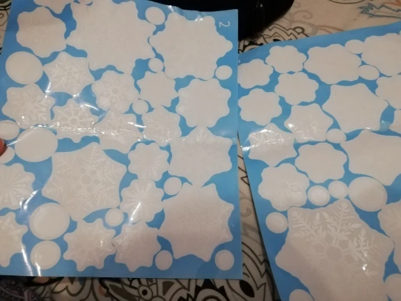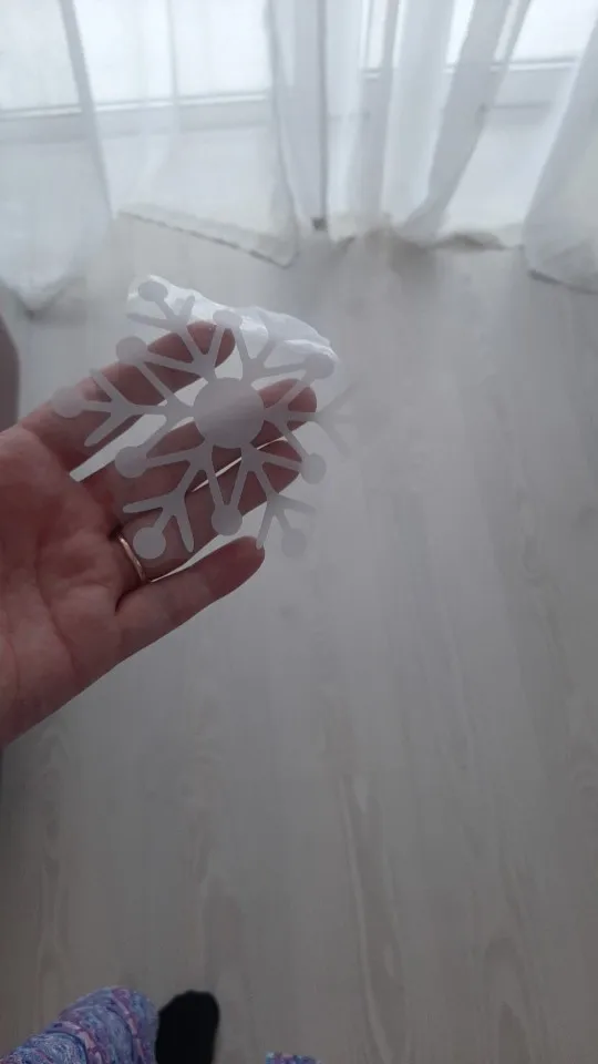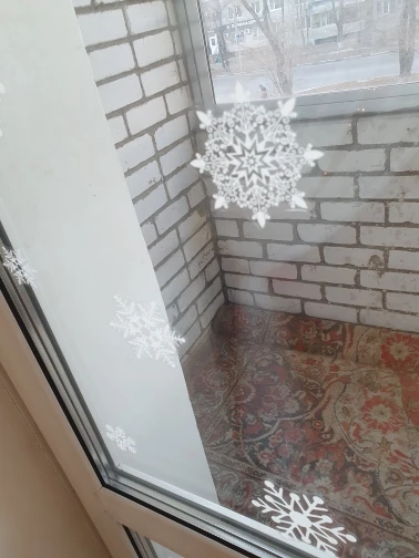 Сами снежинки очень красивые, на стекло сами липнут за секунду. Стекло чистое остаётся. А вот рисунок не соответствует заявленным продавцом, мне пришли 3 листа практически с одинаковыми снежинками. Хотела три окна сделать разными - не вышло.это конечно мелочь, но когда рушатся планы под Новый год- раздражает