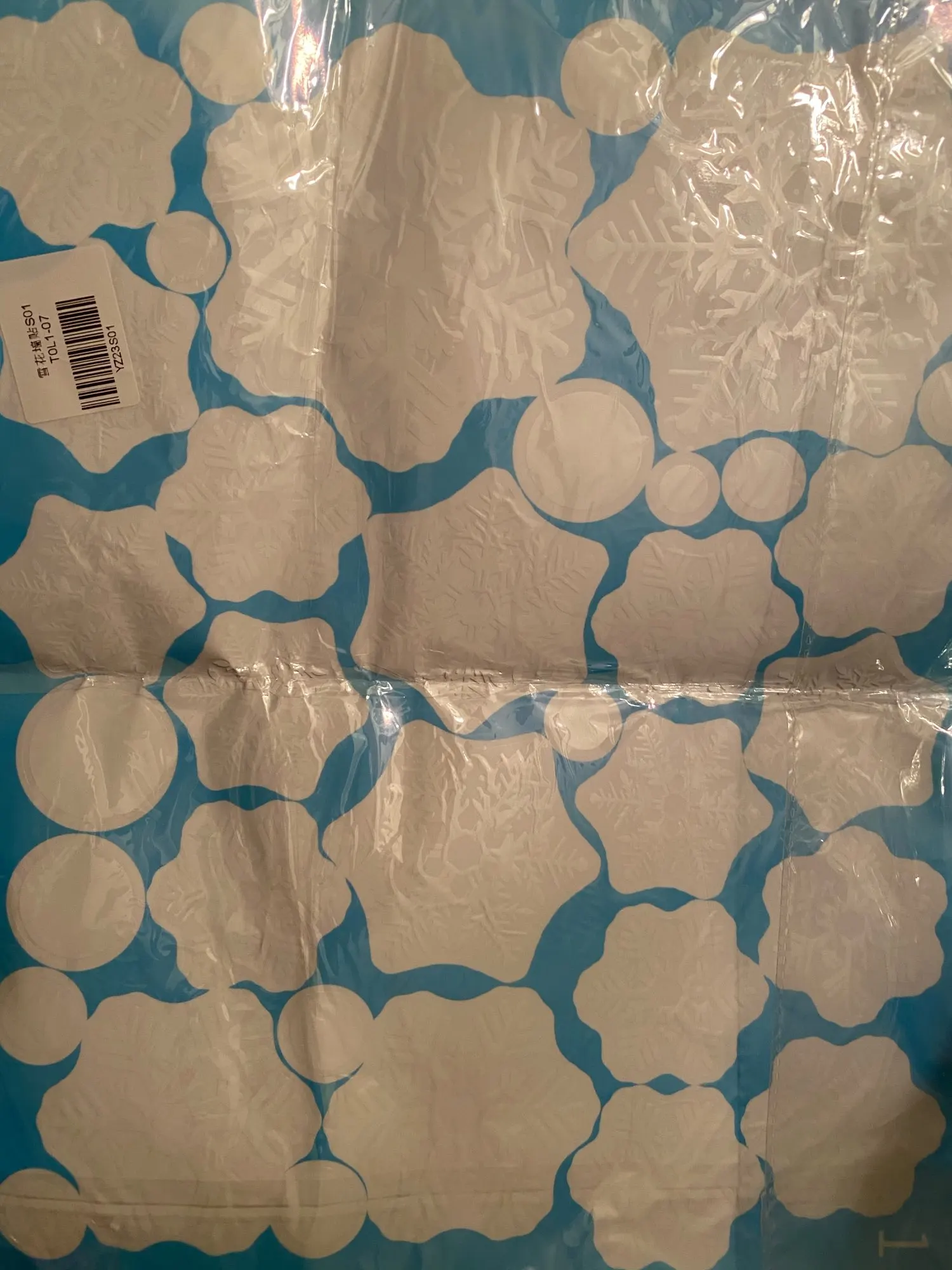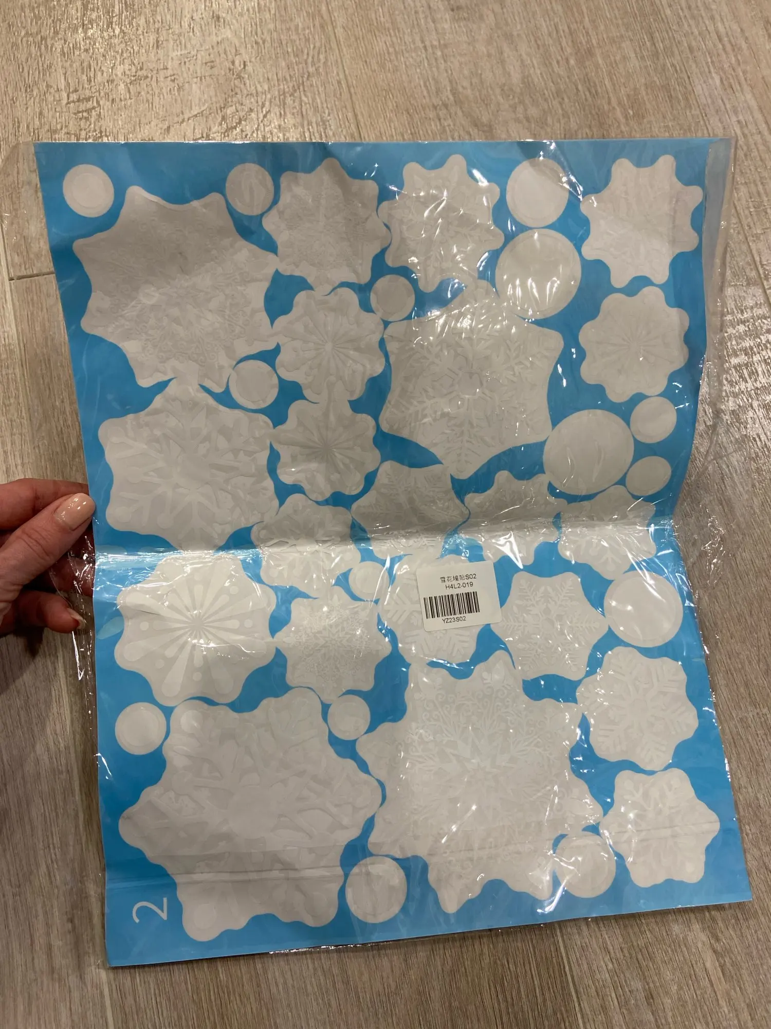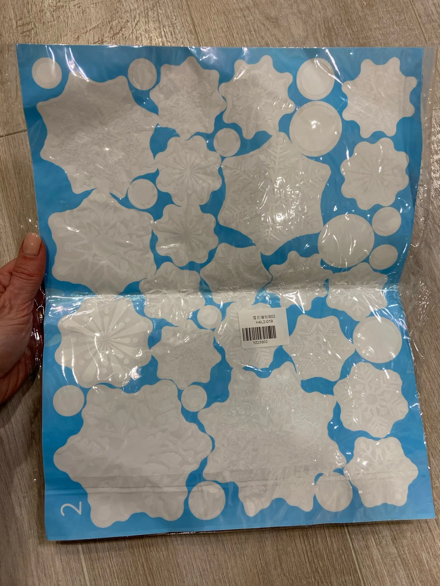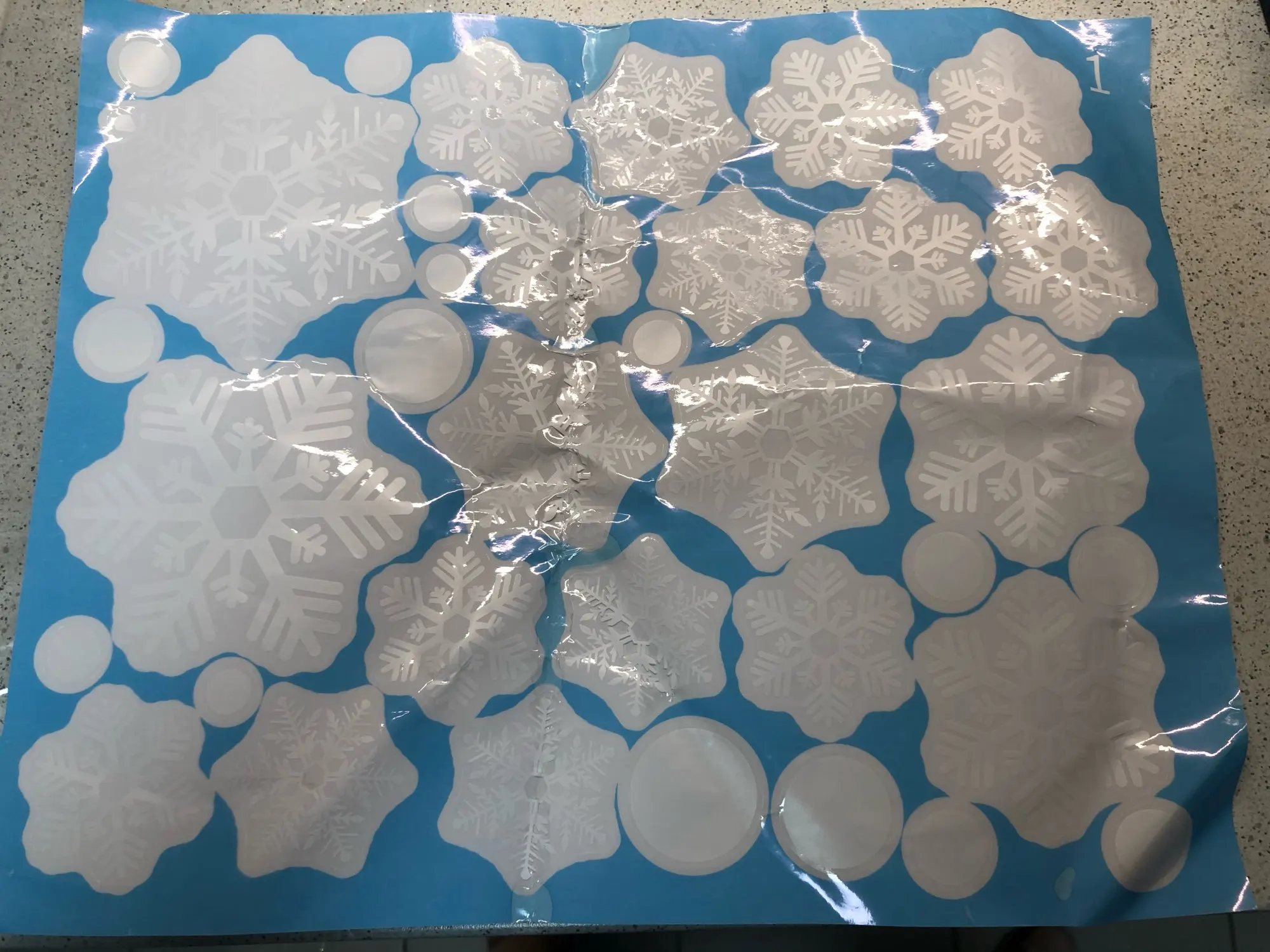 Снежинки многоразовые, напечатаны на тоненькой пленке, прикладываешь к стеклу и она держится. На наши окна лучше 2 комплекта брать.