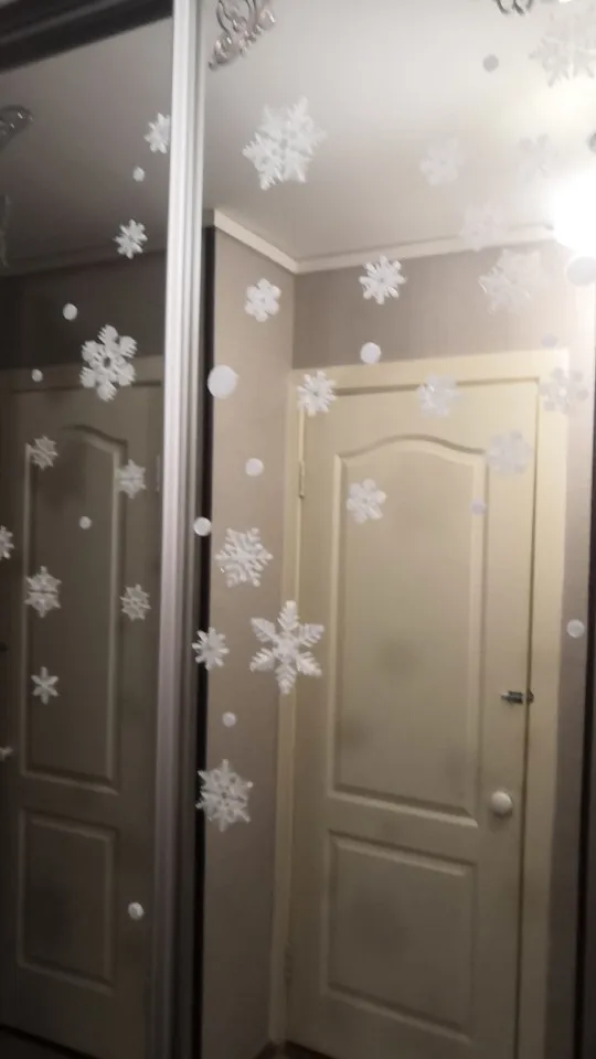 очень красивые снежинки кроме снежинок Тут ещё есть кругляшок очки в виде Просто таких круглых снежинок клеится очень легко выглядят аккуратно красиво Мне нравится количество количество тоже достаточно если у вас немного окон единственное пожелание чтобы основа на чём приклеенные снежинки было ни белого цвета то для того чтобы лучше было видно Какие снежинки и кружочки уже сняты