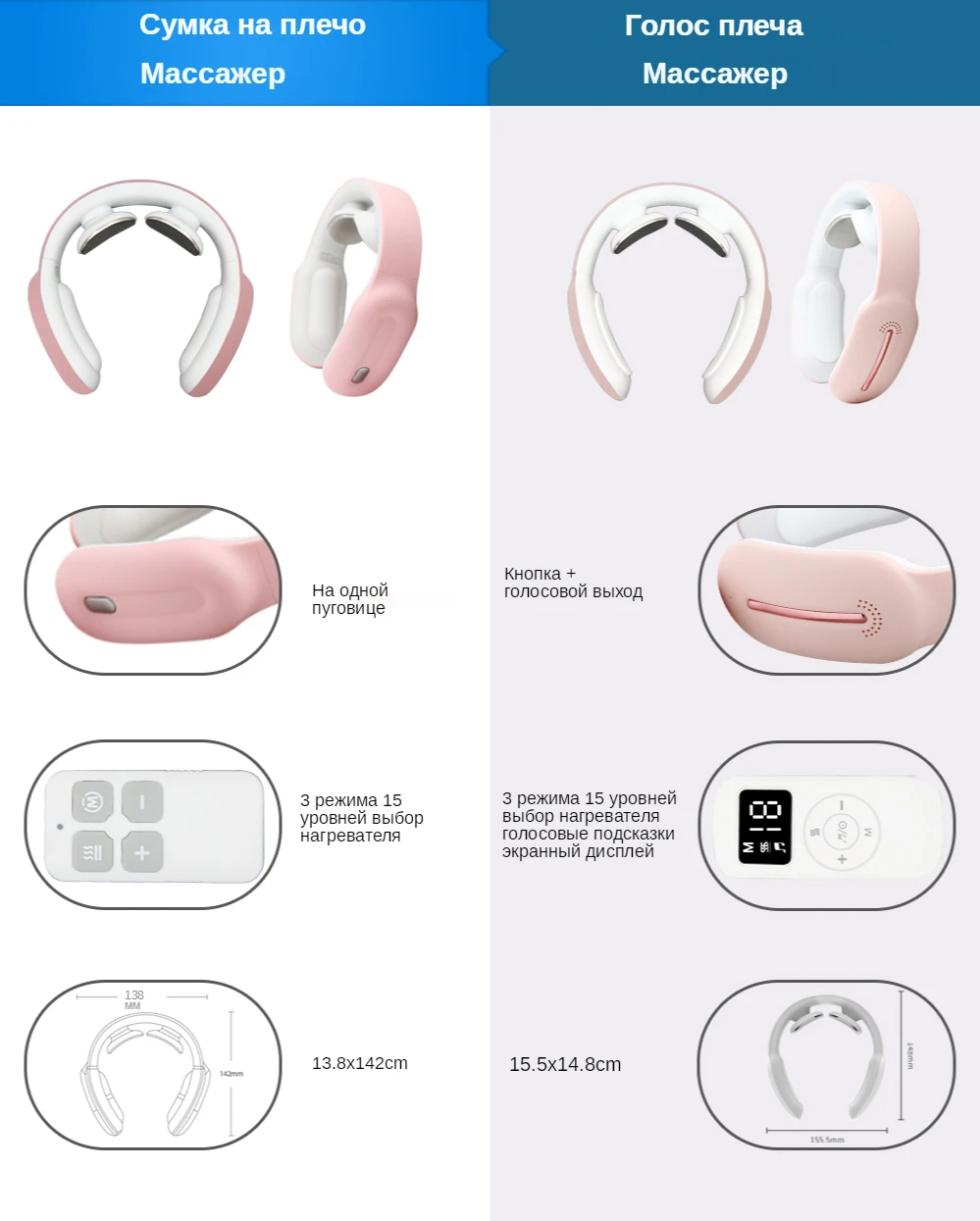 Массажер для шеи поможет вам снять дискомфорт шеи Кому нужен массаж шеи? Вы часто чувствуете себя пробованным после долгого дня перед компьютером? У вас проблемы с болью в шее? Часто ли у вас головные боли из-за боли в шее? На какую-либо поверхность портативный дизайн Он автоматически отключится через 15 минут работы Заряжается с помощью Micro-USB общего интерфейса, избавляясь от ограничений традиционных линий. Он Сверхлегкий и портативный, может использовать его в любом месте, даже в самолете. 3 режима + 15 интенсивности Режимы: Успокаивающий режим Жизненную силу режим Автоматический режим, применение для ежедневного массажа 15 видов интенсивности для удовлетворения ваших различных потребностей в массаже, обеспечивая Вам лучший комфортный опыт. Удобно, как горячее полотенце. Стимулирует кровообращение, восстанавливает боль в шее и усталость. Стимулирует и расслабляет мышечное давление одновременно. Пульт дистанционного управления Просто нужно нажать кнопки на пульте дистанционного управления, вы можете выбрать режим и интенсивность, который вам подходит. Интенсивность будет восстановлена до уровня 0, когда режим был изменен.