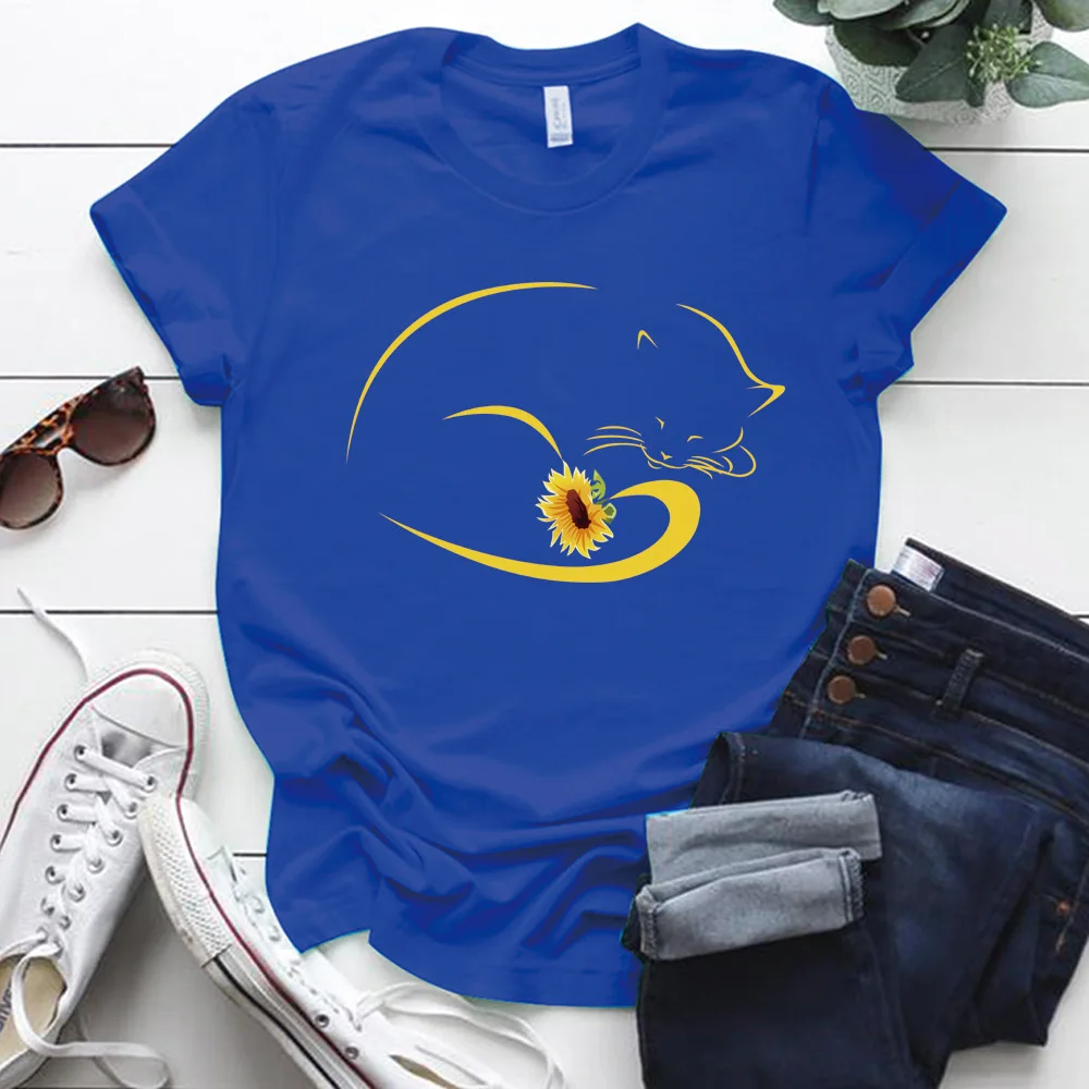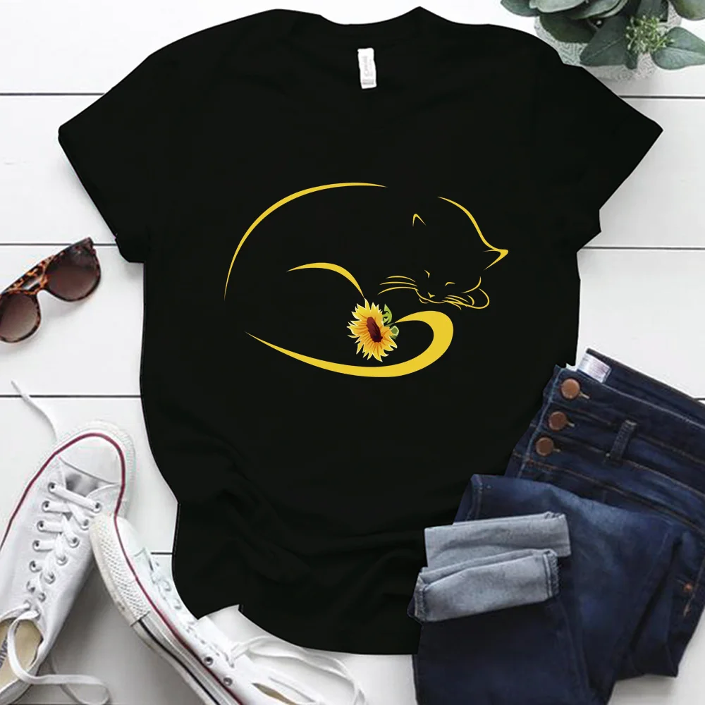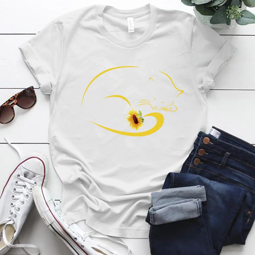 Футболка женская оверсайз с рисунком спящего кота, принт подсолнечника, подарок для леди, размера плюс с коротким рукавом в стиле Харадзюку, S-5xl
