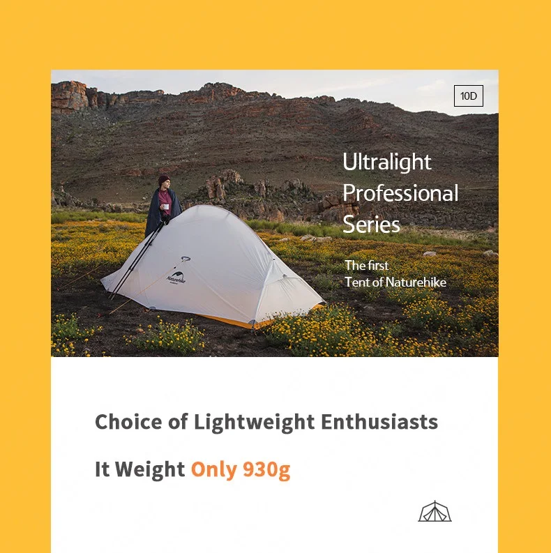 Бренд: Naturehike Название: облачный Сверхлегкий тент для 2 человек 10D Вес: 930 г (за исключением гвоздей и ветряных канатов) Размер: (210 + 60)* 130*105 см Размер упаковки: φ 14*46 см Аксессуары: гвоздь для заземления * 14/ветряная веревка * 5(260 г) Цвет: Золотой, оранжевый Описание материалов Внешняя палатка: 10D нейлон с силиконовым покрытием плед/водонепроницаемый 2000 мм Внутренняя палатка: B3 тонкая дышащая сетка из полиэстера/10D дышащая ткань Нижняя палатка: 20D нейлон с силиконовым покрытием плед/водонепроницаемый 3000 мм Шатер: 7001 алюминиевый сплав