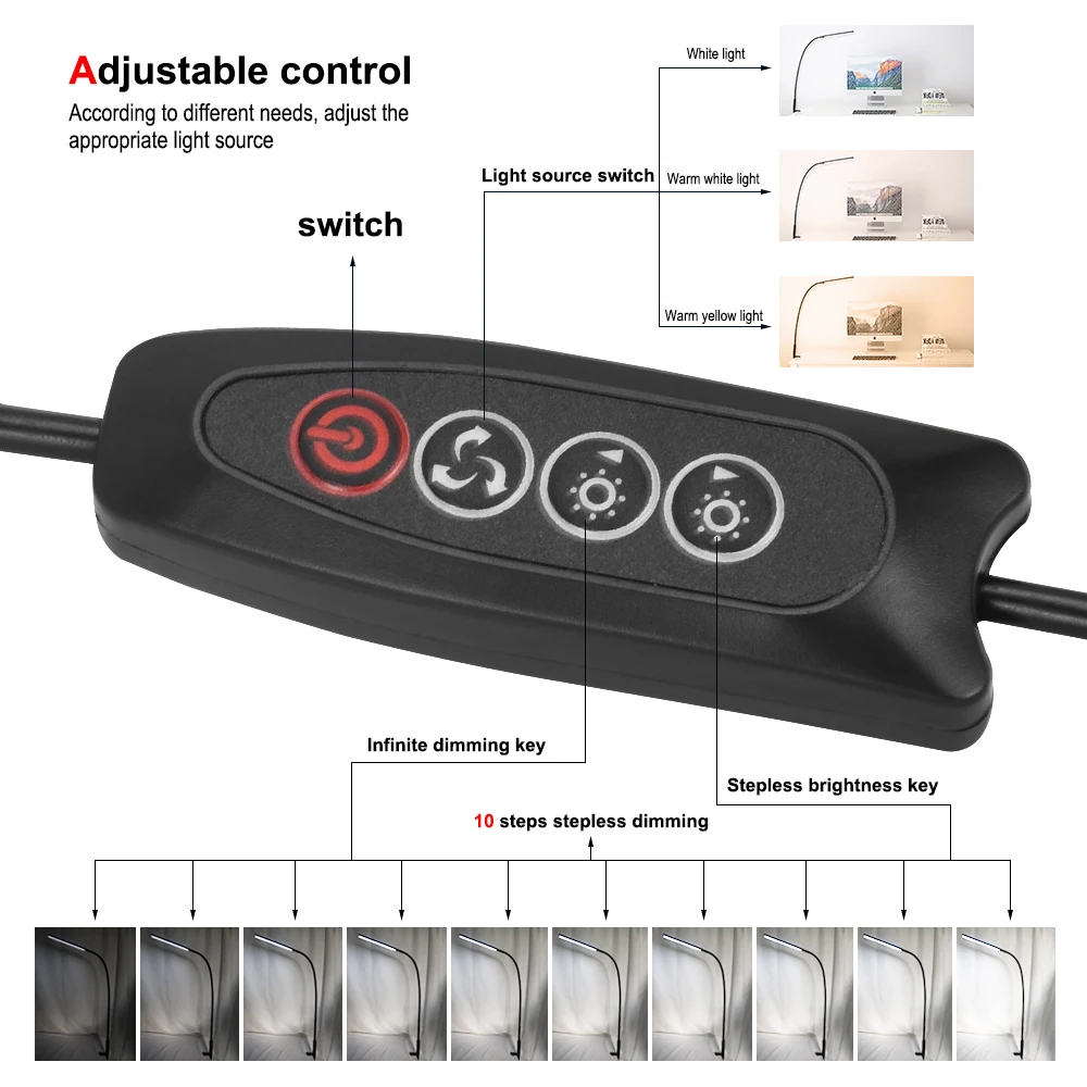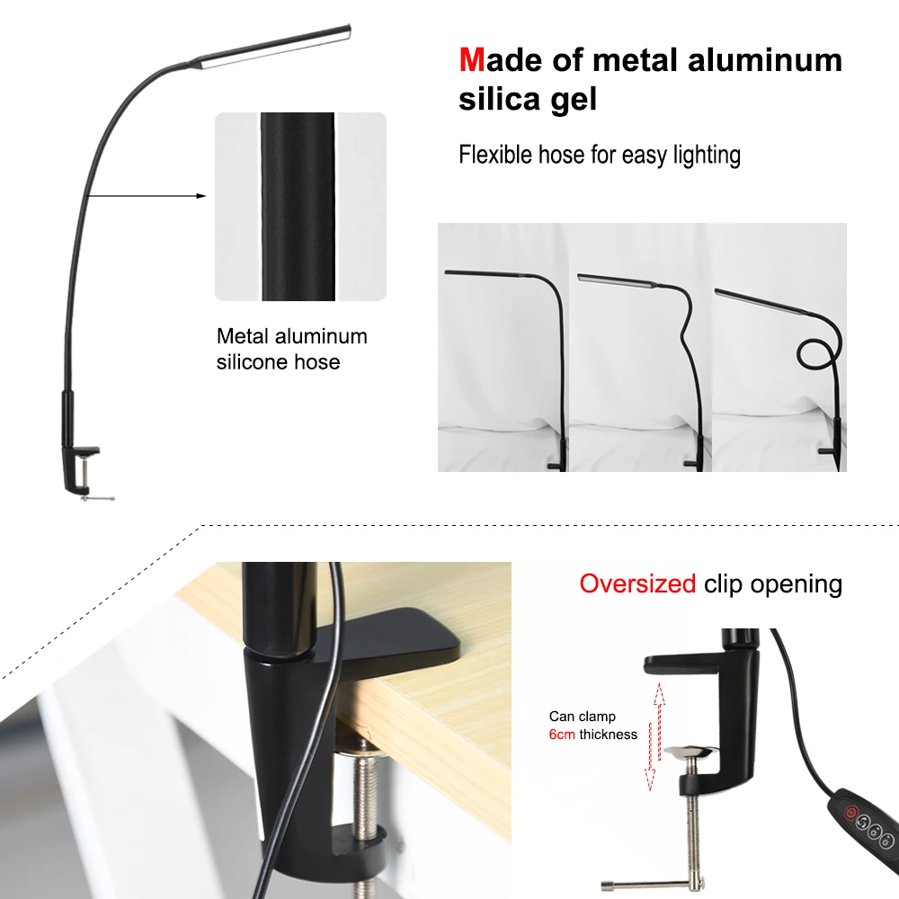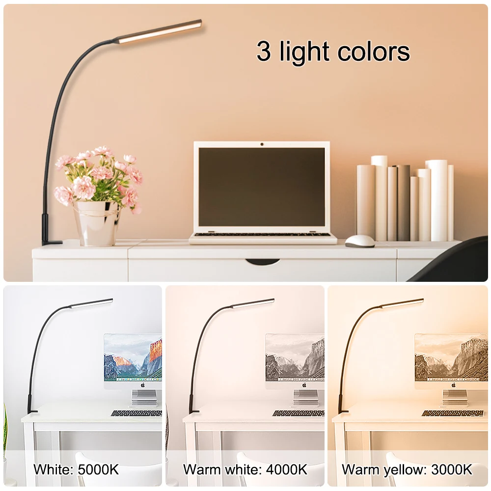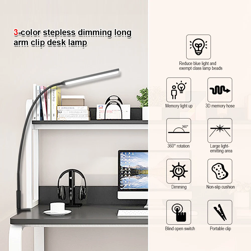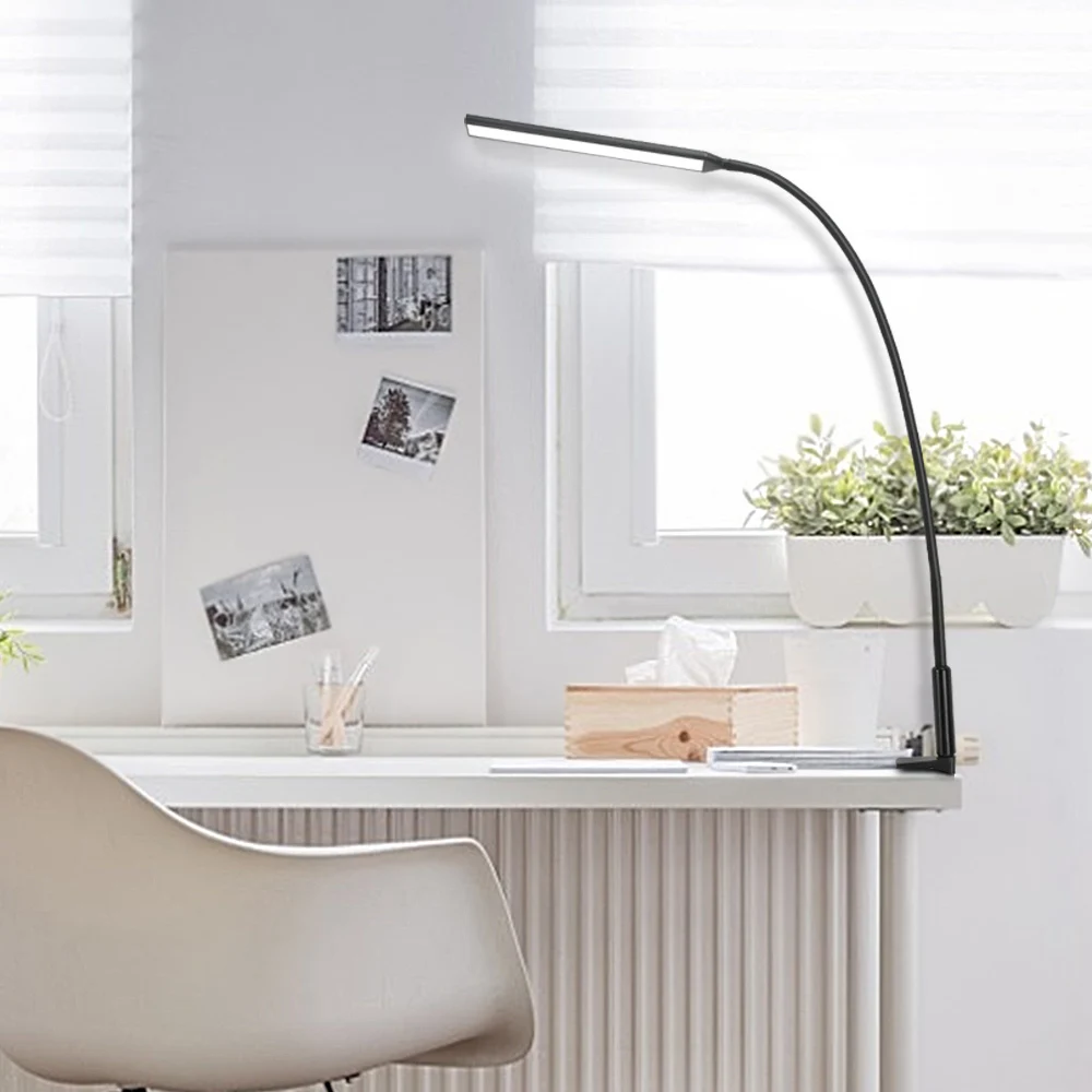 Длинная Светодиодная настольная лампа 10 Вт, Гибкая Настольная лампа с зажимом, регулируемая яркость и цветовая защита глаз для спальни, чтения, офиса
