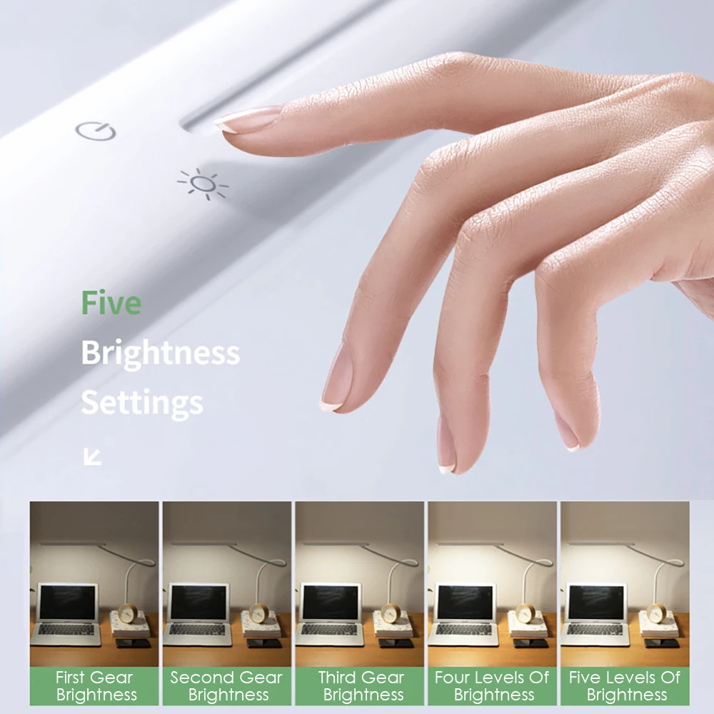Портативный дизайн и экономия пространства:Этот гибкий светодиодный настольный светильник позволяет гибко поворачивать светильник и регулировать его положение по мере необходимости. Удобно брать с собой, легко размещать на музыкальных стендах, книжных полках, офисных столах, компьютерных столах, головных платах, велосипедных головках и т. д.