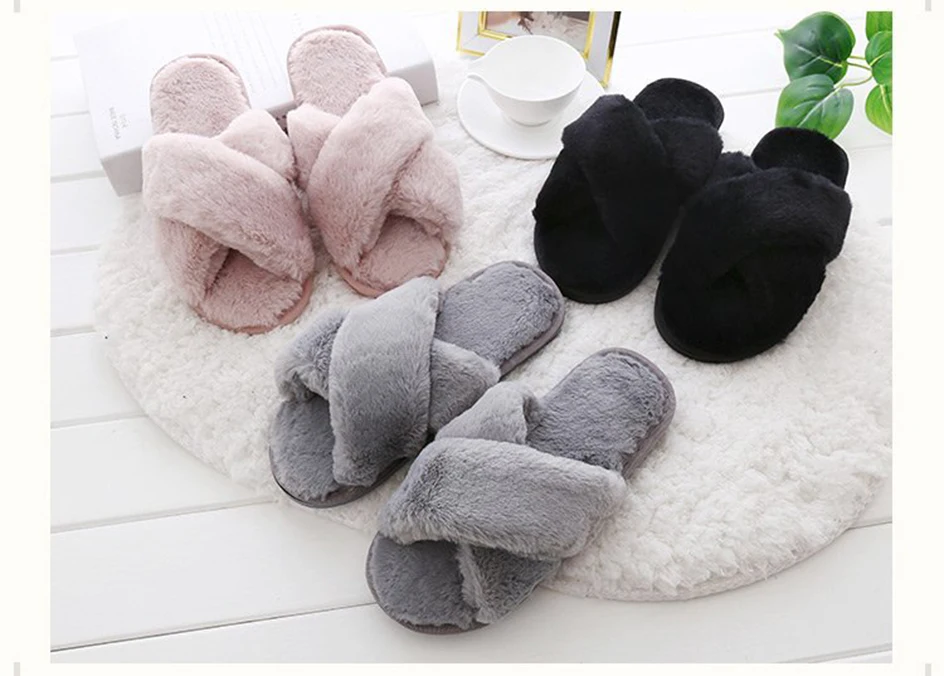 Тапочки женские меховые, на плоской подошве, с перекрестными ремешками