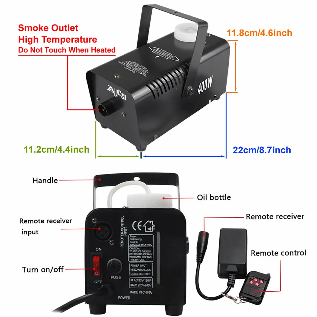 Спецификация: Напряжение: 110 В переменного тока или 220 В-240 В/50-60 Гц, Номинальная мощность: 400 Вт, Предел страховки: 230 В @ 5A, 110 В @ 10A, Масло Ёмкость бака: 0,25 л Количество дыма: 6000 куб/мин, Время разогрева: 10 мин, Расстояние дыма: 3 м, Продолжительное время дыма: 30-40S, Управление: беспроводной пульт дистанционного управления, Подходящая площадь: около 20 квадратных, Товар Размеры: 22x11,2x11,8 см, Размер упаковки: 29x19x19 см, Брутто Вес: 2,5 кг. Посылка включает: 1x400 Вт дымовая машина, 1 x Кабель питания (подходит для глобальной вилки питания), 1 x беспроводной пульт дистанционного управления (без аккумулятора). Применимое место: DJs, группы, бары, пабы, клубы, катки на роликовых коньках, KTV, семейные вечерние, дни рождения, торжества, свадьбы, фестиваля, торгового центра, магазина, магазина и других назначенных мест. Примечание: