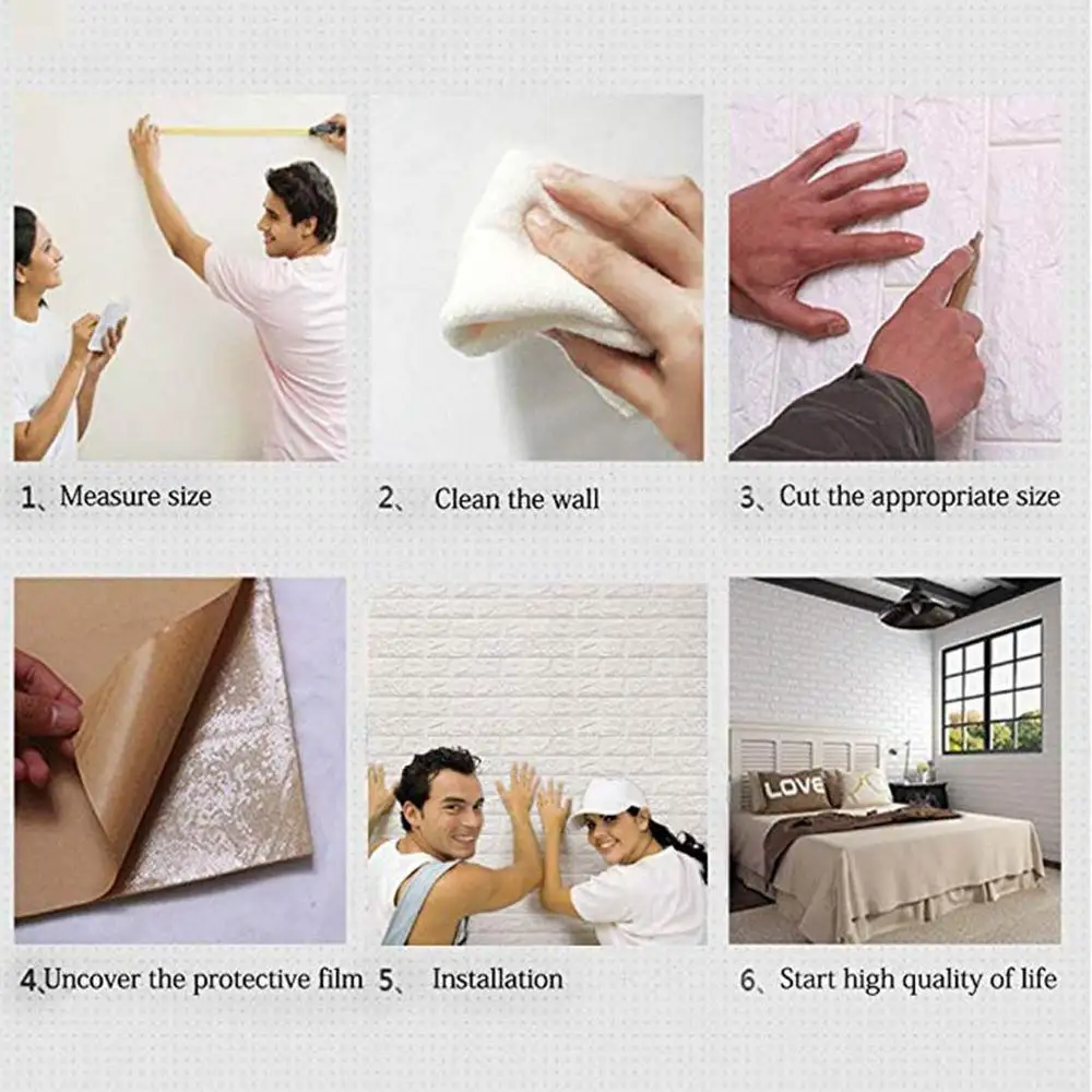 Характеристика: 1: трехмерная декоративная мягкая пена, защита от столкновений для детей, забота о вашей семье. 2: Безопасность и защита окружающей среды, нетоксичный запах, подходит для семейного безопасного домашнего пространства. 3: Реалистичный, естественный эффект кирпичного узора, простой и современный стиль. 4: Бесплатный DIY, простой самоклеящийся дизайн, установка, повседневный коллаж, произвольный крой. 5: сравнение обоев с улучшенным эффектом шумоподавления. Способы установки и инструменты Подготовка: Очистите поверхность с адгезией, например: поверхность из дерева, поверхность из стекла, не Пылезащитная стена, нажмите на дно шпатлевки и так далее. Паста: задняя крышка разорвана бумага наклеена на вспомогательные инструменты: ножницы, нож Внимание: пожалуйста, купите достаточное количество единиц товара, чтобы убедиться, что они поставляются из одной партии, чтобы избежать разницы в цвете.