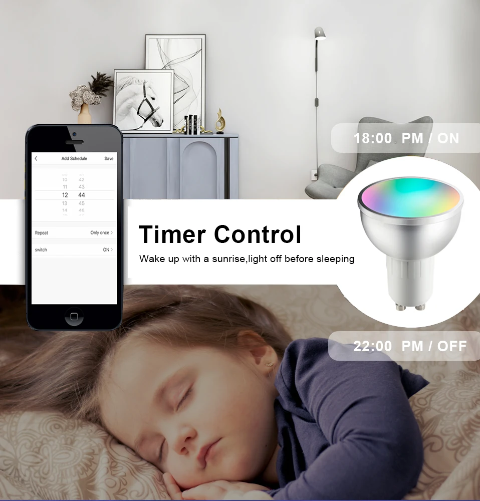 [Функция таймера]-Настройте умные Wifi лампы так, чтобы они автоматически включали и выключали электронику в зависимости от времени установки. Вы также можете настроить домашнюю систему освещения, например: 7 утра, 11 утра.