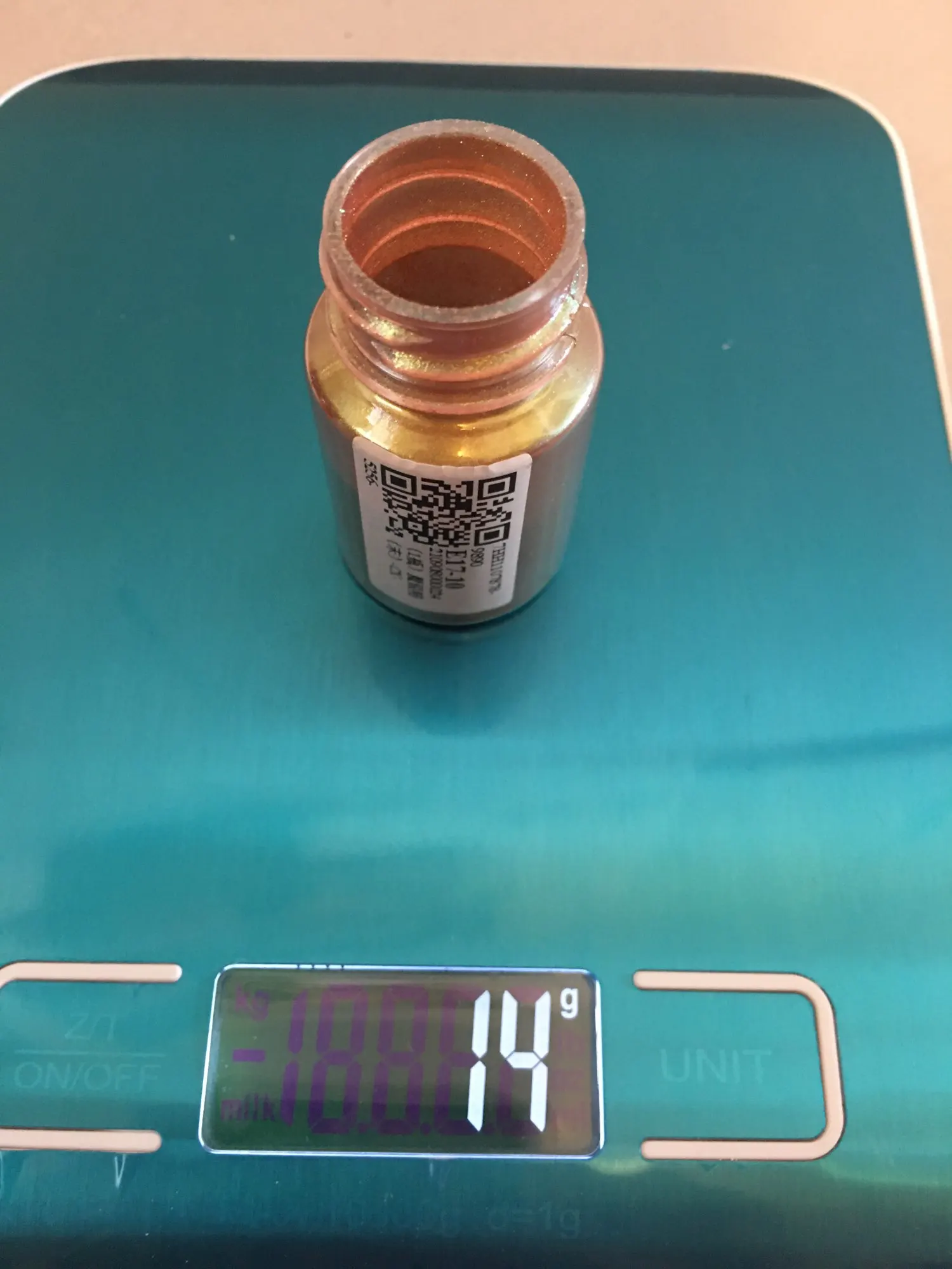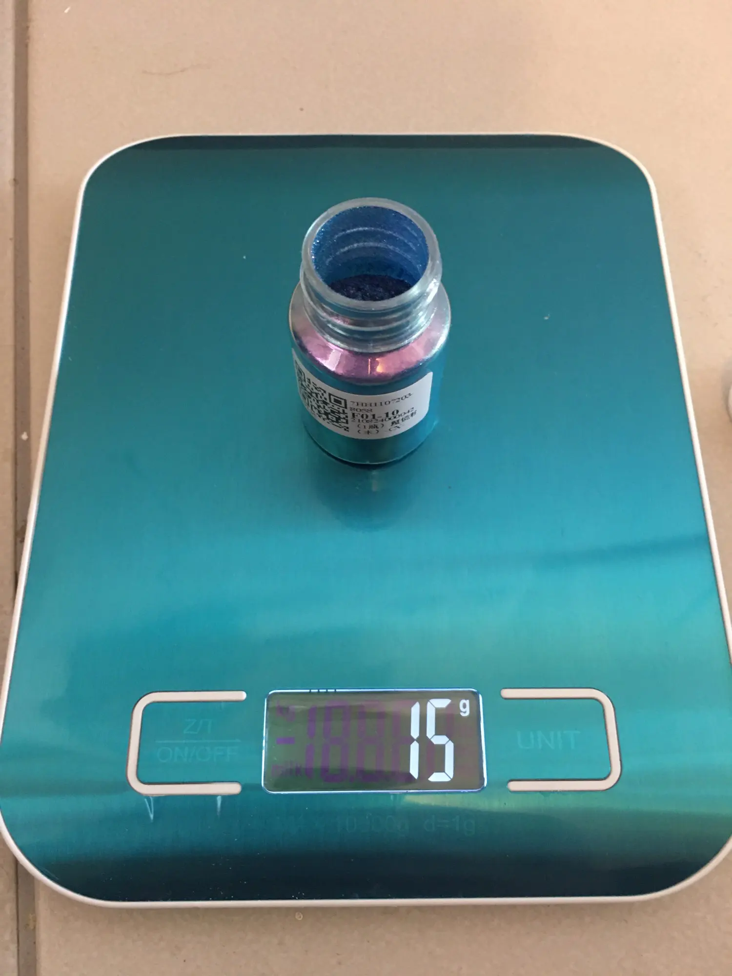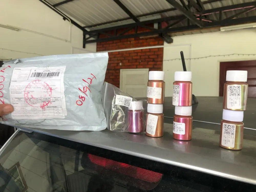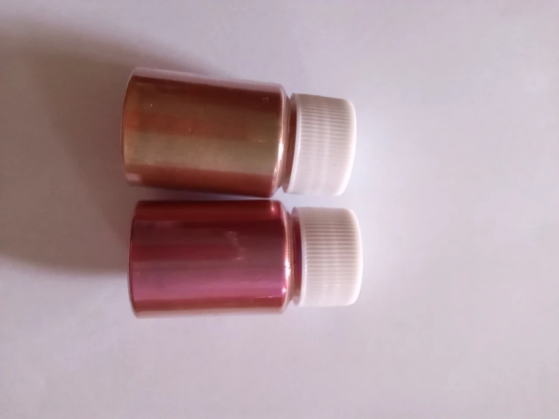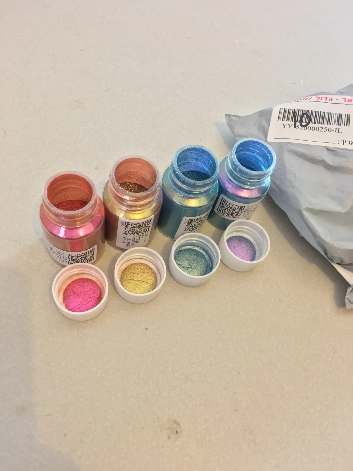 Algunos colores no son tan tornasolados o perlados sino más bien plenos. Los frascos no vienen llenos enteramente y su peso aproximado es entre 13 y 15 gramos (contando el frasco). Falta probarlo con la resina para ver su color en totalidad. Envío a Israel en 40 días.