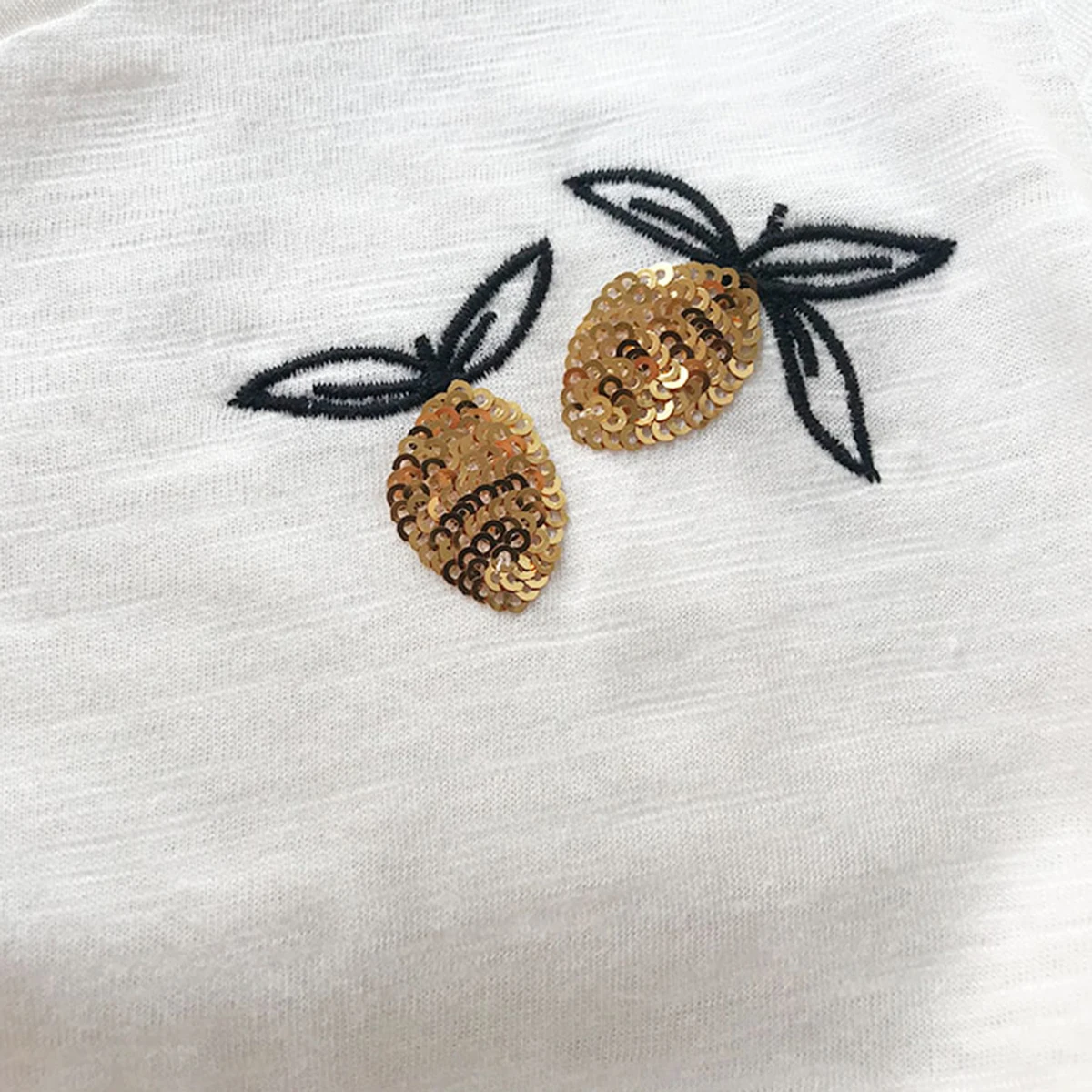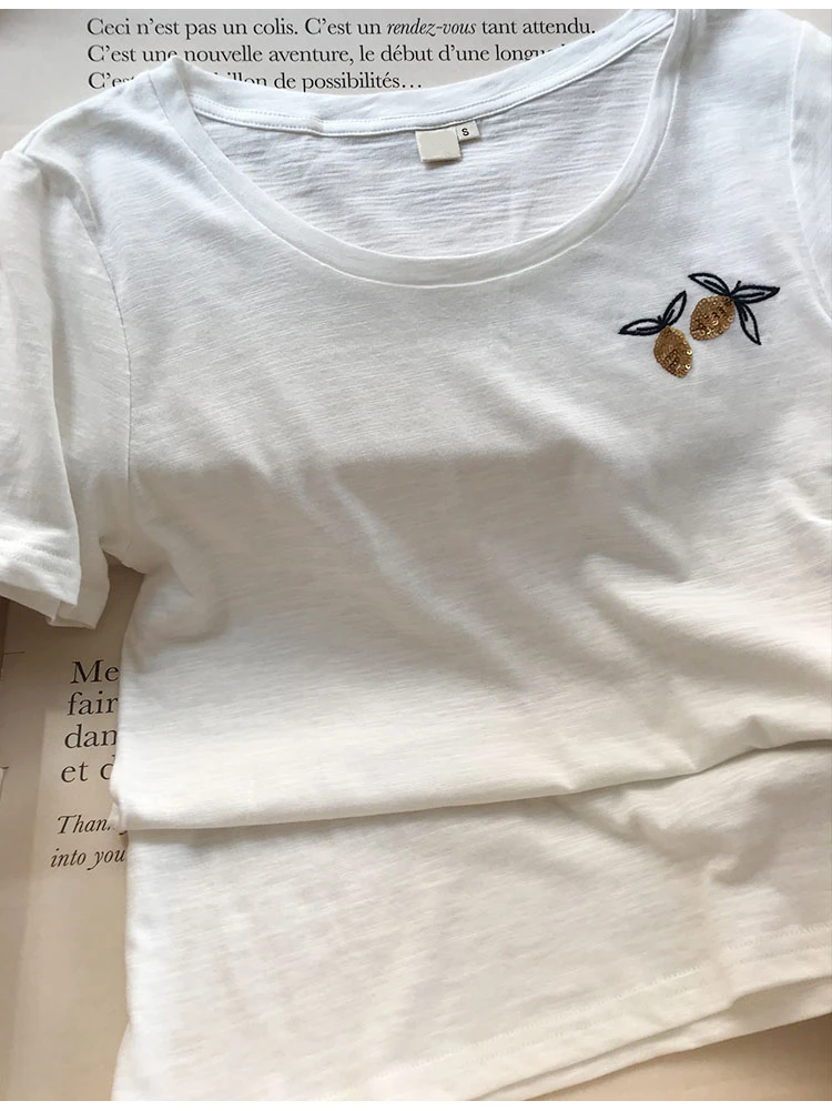 Футболка женская с вышивкой из лимона, белый льняной Повседневный Топ с коротким рукавом и круглым вырезом, простая винтажная искусственная рубашка, на лето