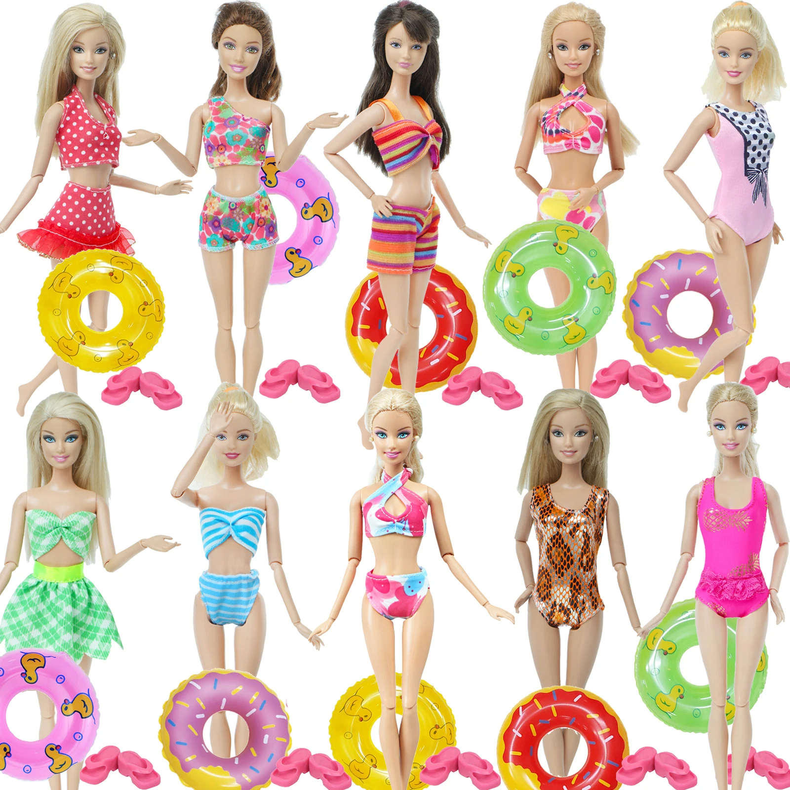 Милое пляжное платье ручной работы с бантом, бикини, купальники + случайный круг для плавания + тапочки для кукол Барби, аксессуары для кукол, кукла в купальнике