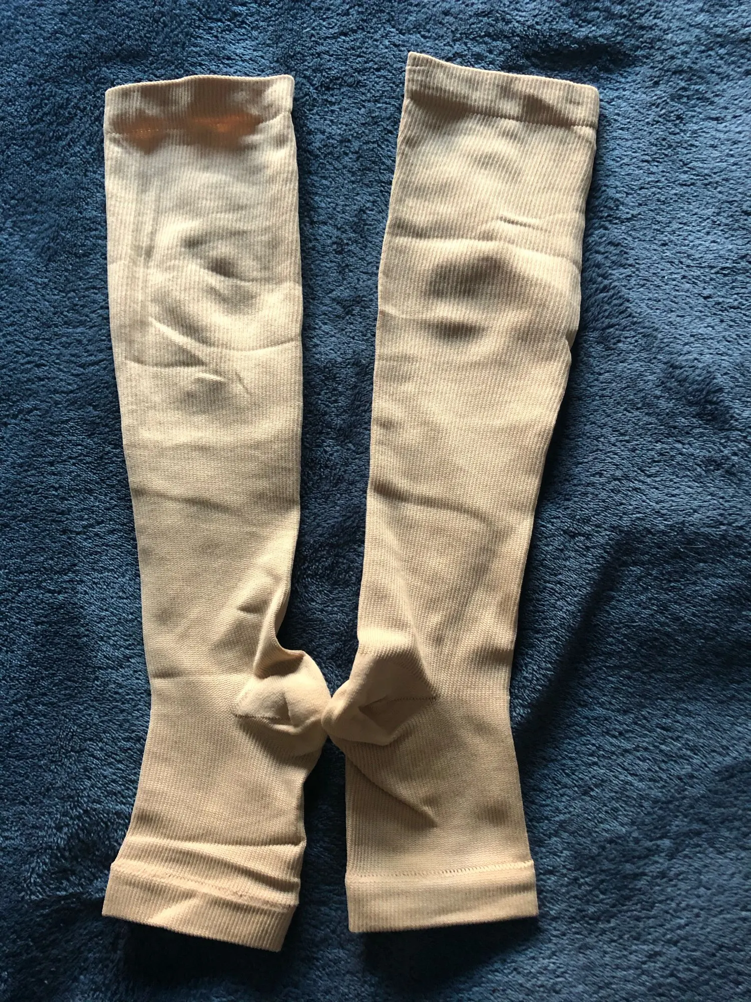 Компрессия не очень сильная, как очень плотные колготки, носочек чуть короче - до середины стопы. Доставка быстрая - меньше двух недель