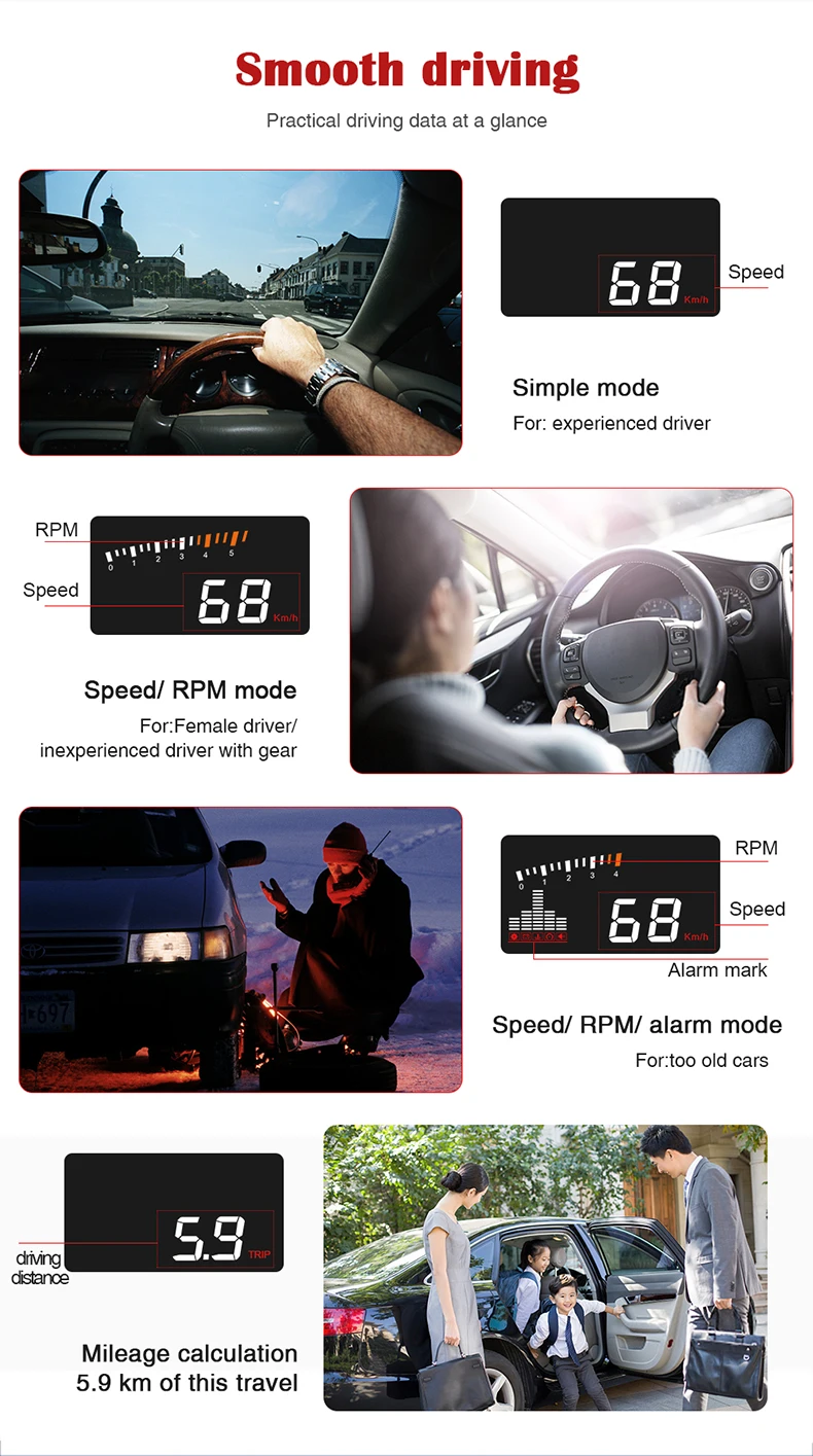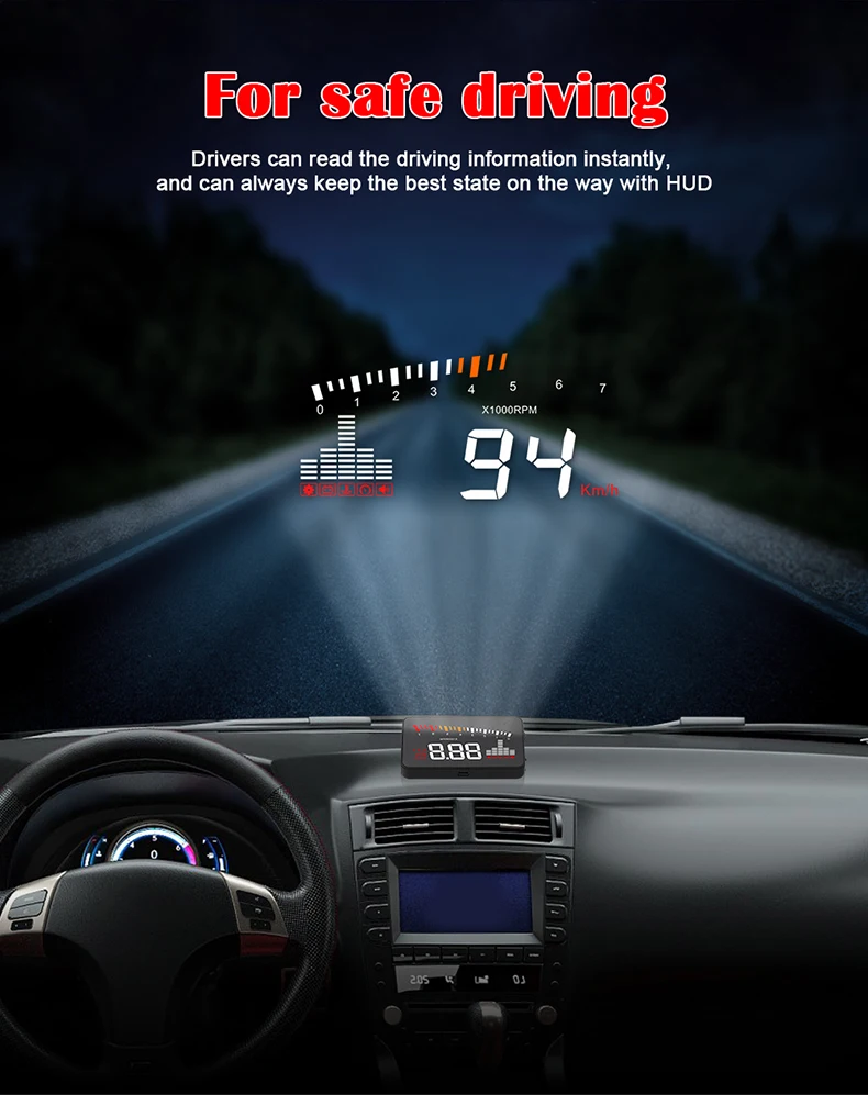 Этот продукт предназначен для безопасности водителей, особенно при скоростном вождении в ночное время, HUD может следить за водителем на дороге и может уменьшить аварию. HUD может проецировать важную информацию (например, скорость) на лобовое стекло, это может помочь неопытному новичку контролировать свою скорость и избежать нарушения скорости в дороге ограничения скорости. Что еще более важно, это позволяет водителю мгновенно считывать число в отличном видении и всегда заставлять водителей взглянуть на дорогу в ясном уме.
