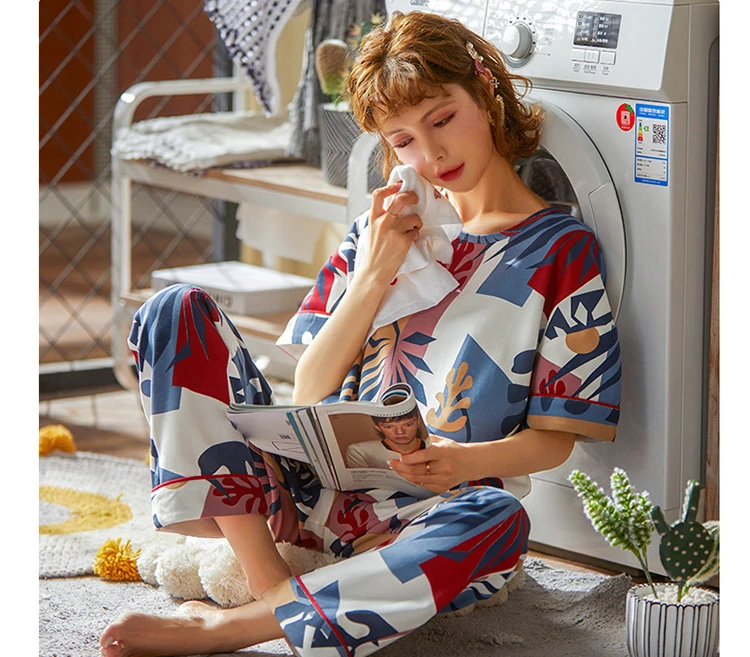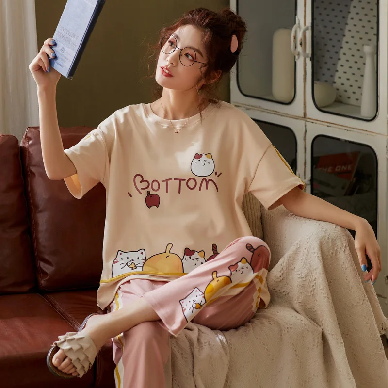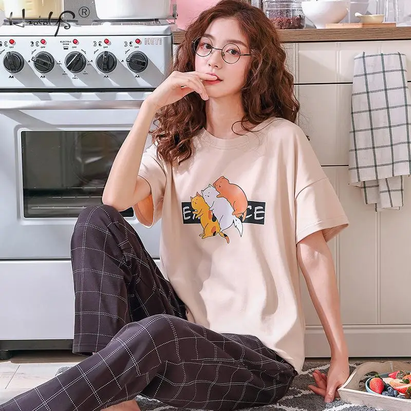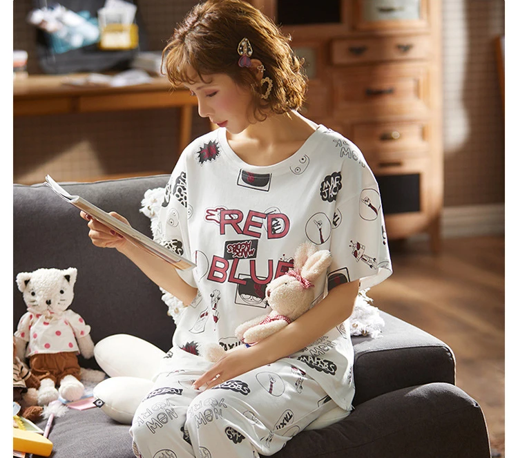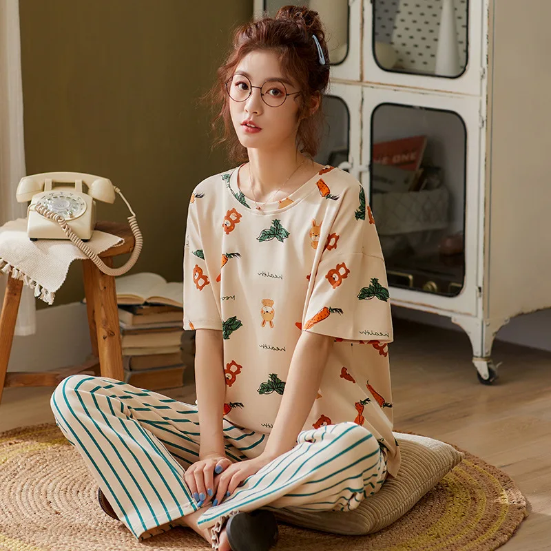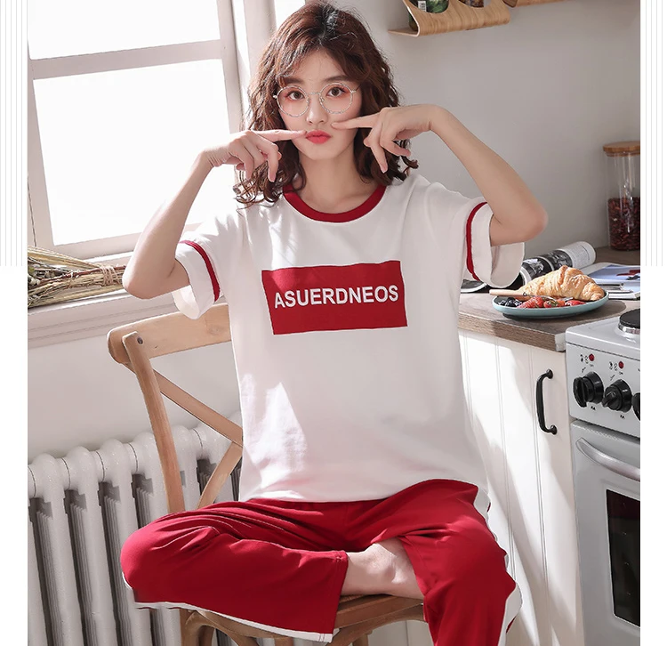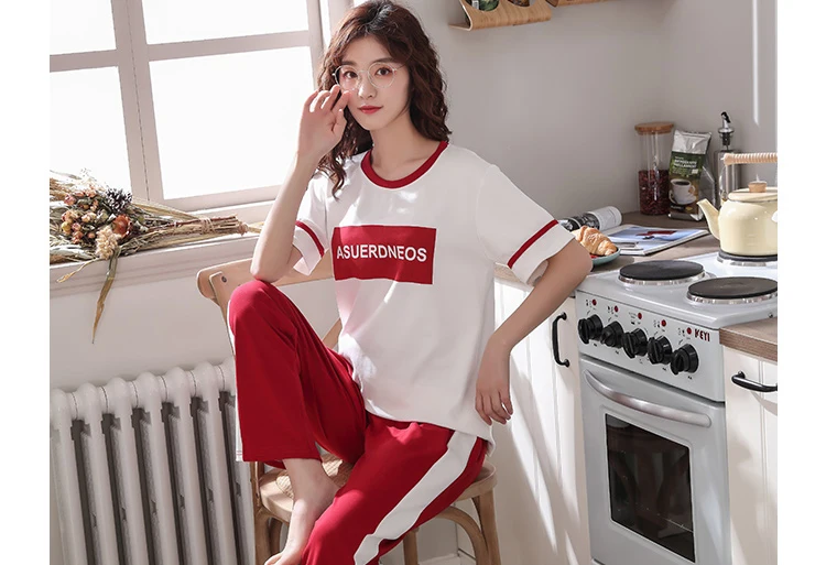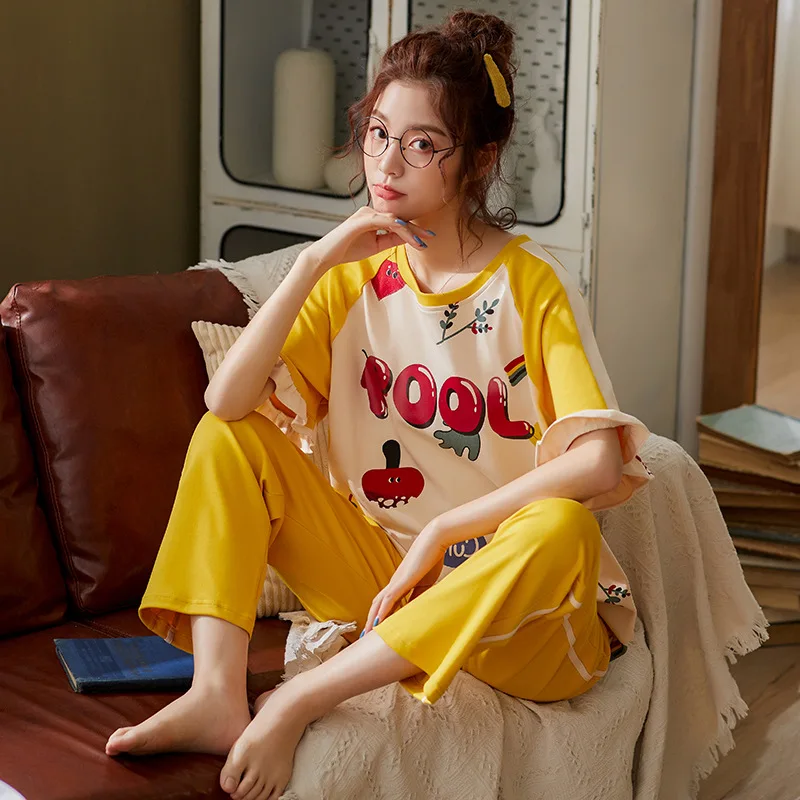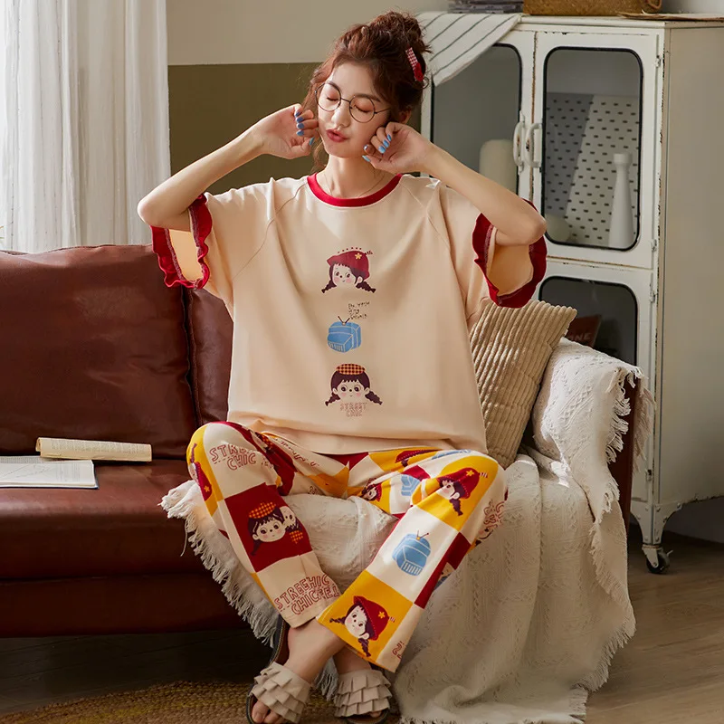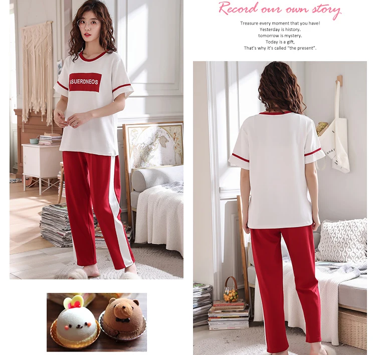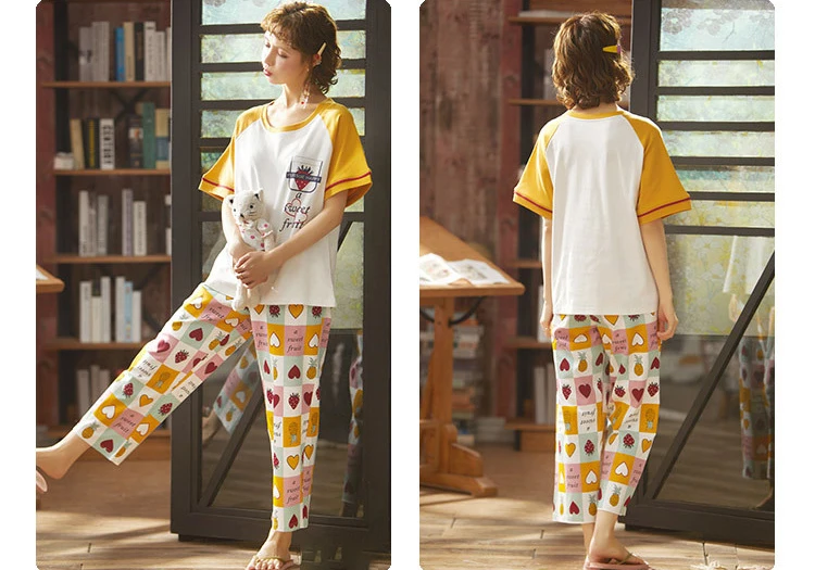 Женский пижамный комплект, теплая Пижама, осенняя Пижама с коротким рукавом + длинные брюки, комплект пижам, милая Пижама, домашний сервис