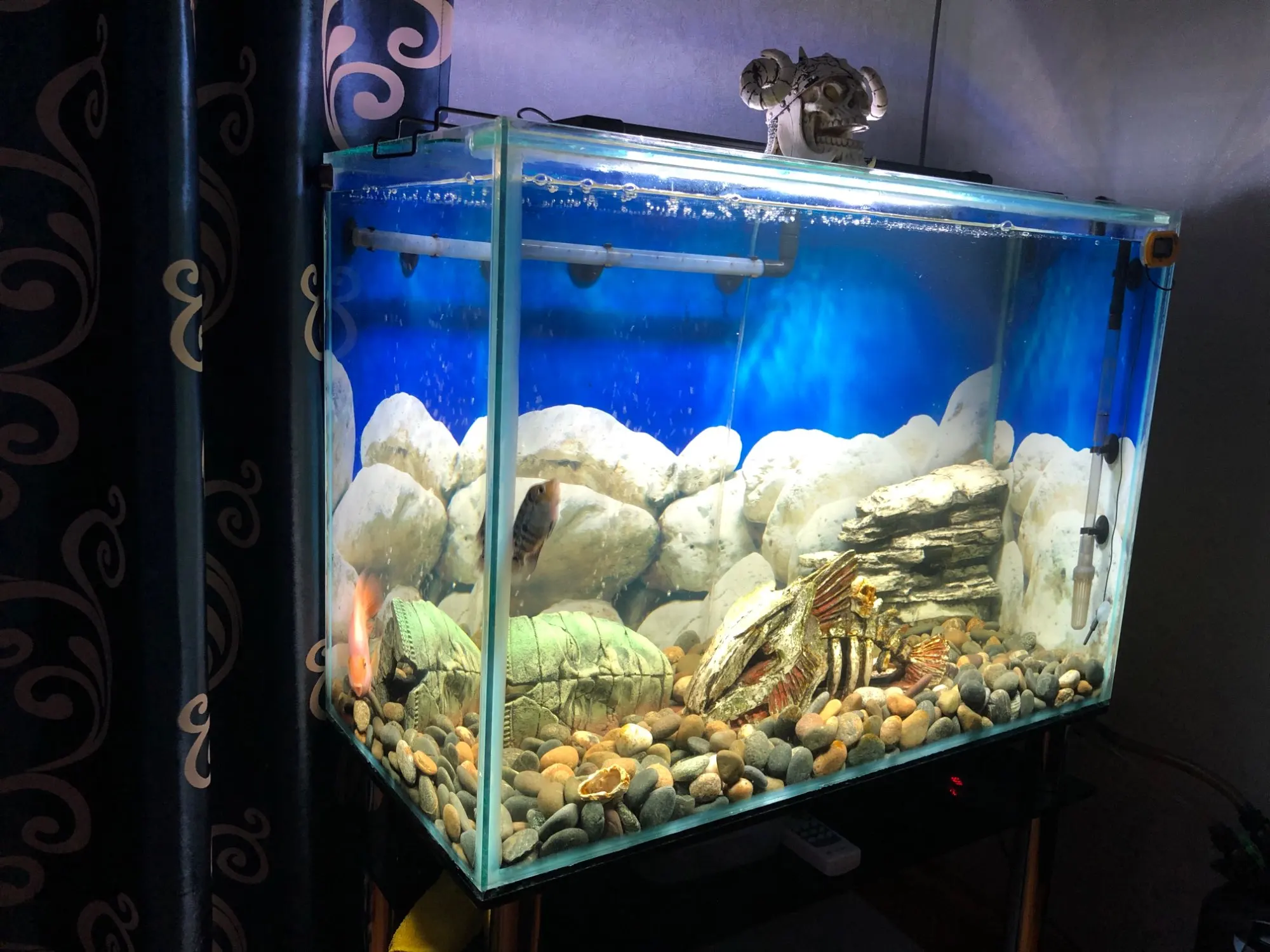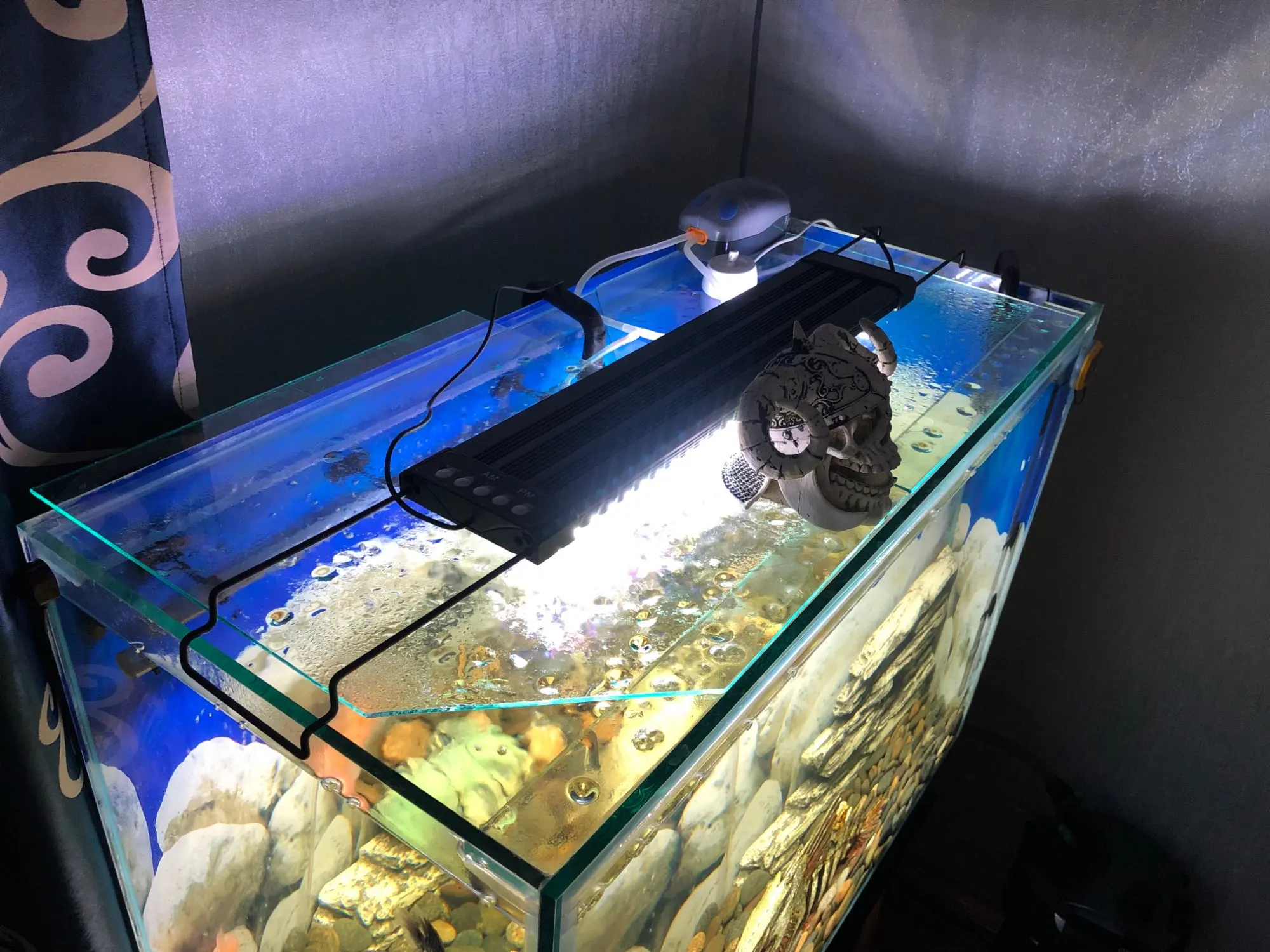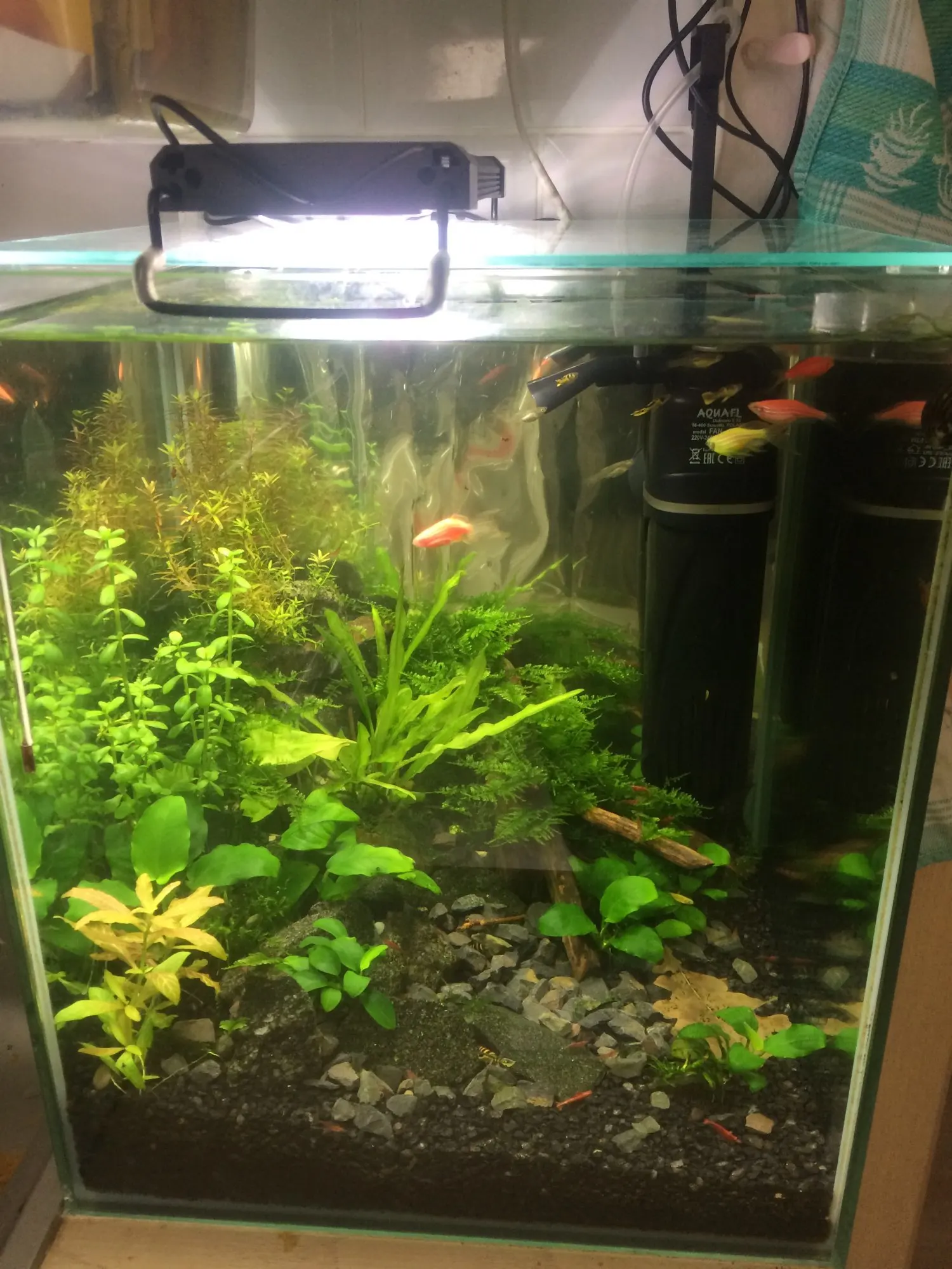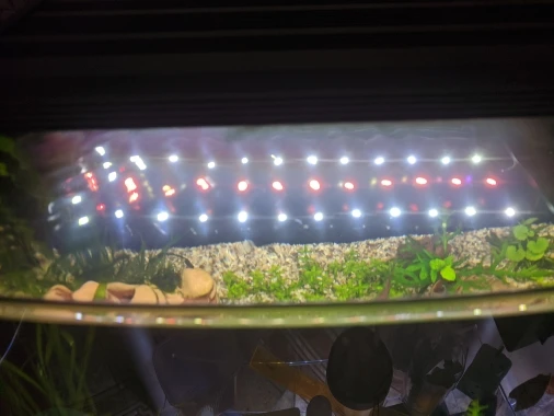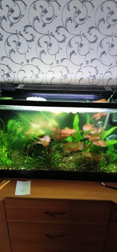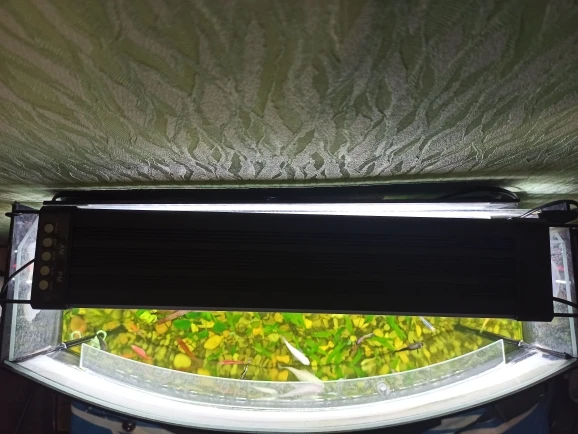 С пультом еще не разобрался на 100%, но лампы нравятся, цена устраивает. В вечернем синем свете все необычно, меченосцы и гупехи с красным цветом кажутся нереальными, огненными. Одна проблема пока- время режимов не могу сменить, в полночь ещё ярковато светит-уснуть трудно. И полного выключения нет, в 3 часа слабый светильник светит-не знаю как скажется на обитателях.
