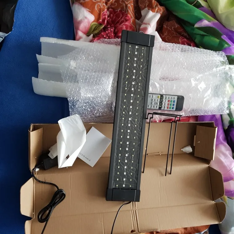 хорошая упаковка. лампа светодиодная для аквариума пришла целая в рабочем состоянии светит ярко все диоды рабочие пульт дистанционного управления рабочий без батарейки вставил свою батарейку режимы день и ночь работает сама лампа немного греется не критично спасибо продавцу!